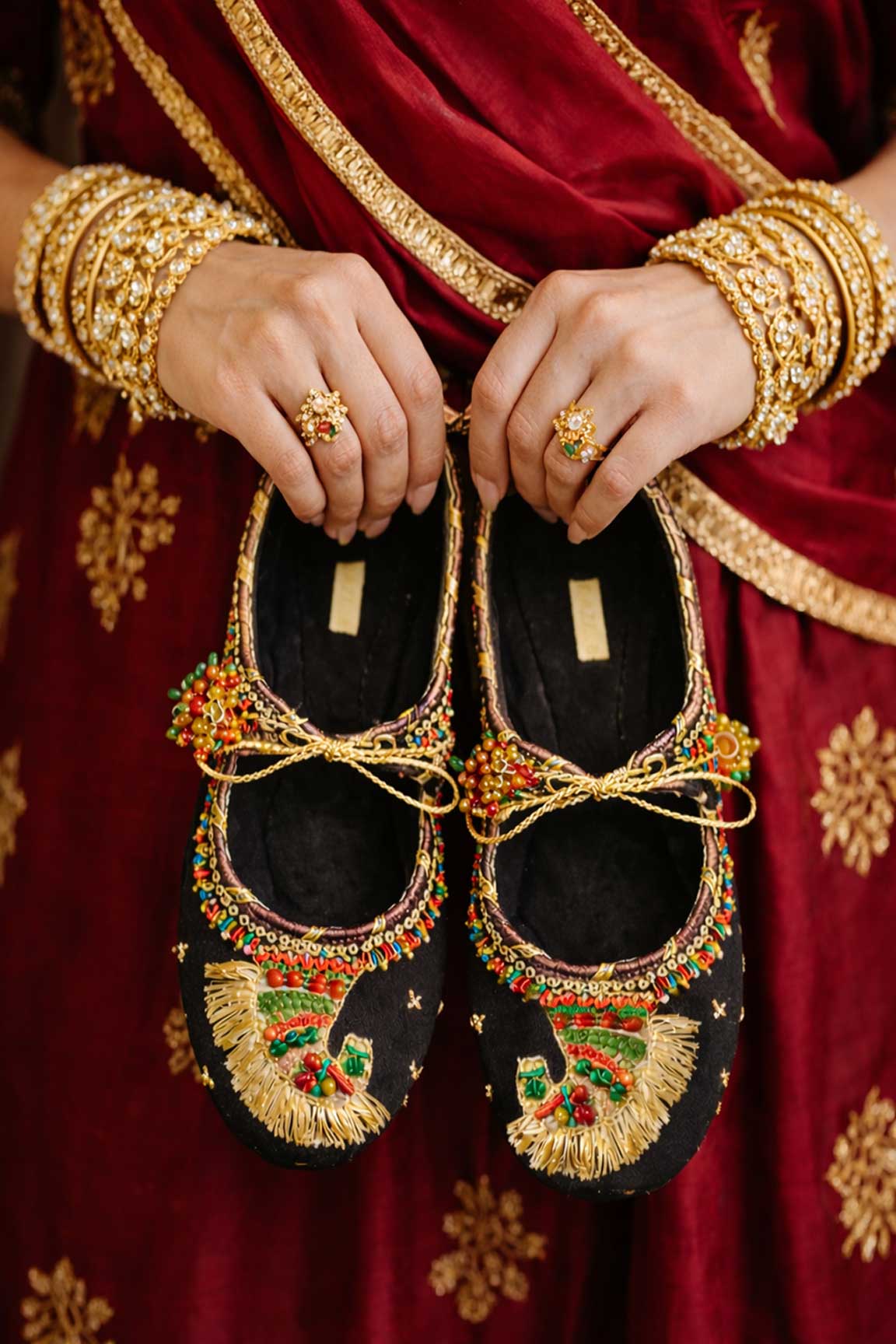 A bold blend of tradition and artistry, this black khussa features intricate horse-inspired embroidery highlighted with vibrant colors and fine handcrafted details. Designed to stand out, it adds a regal, royal edge to festive and wedding looks with effortless elegance.
