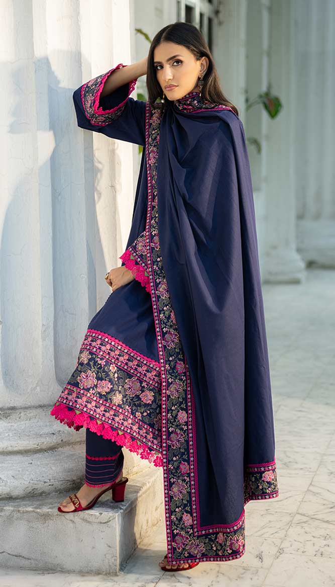 Add charm to your winter look, a deep blue three-piece khaddar set detailed with tassels on neckline and floral multihead embroidery accents. Paired with straight trouser pants and a matching dupatta, it brings together comfort and sophistication for effortless everyday elegance.
