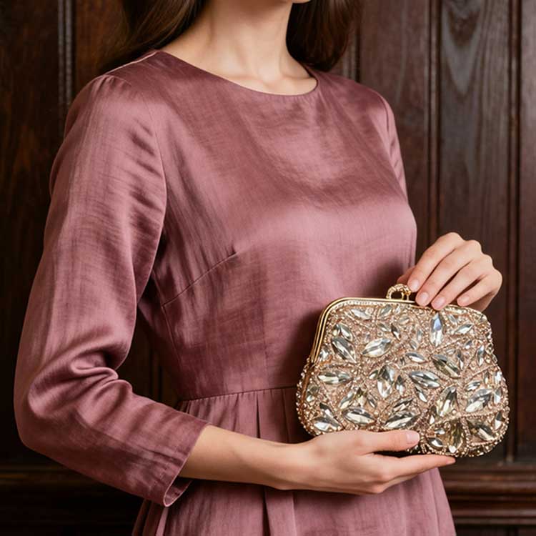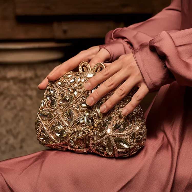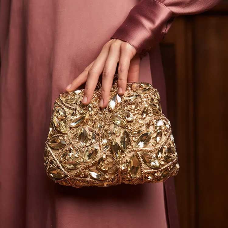 Luxurious and radiant, this statement clutch is adorned with intricate crystal embellishments arranged in a striking floral pattern. Designed to shimmer with every movement, it exudes elegance and high-glam appeal. Perfect for weddings, soirées, and evenings that call for standout sparkle.