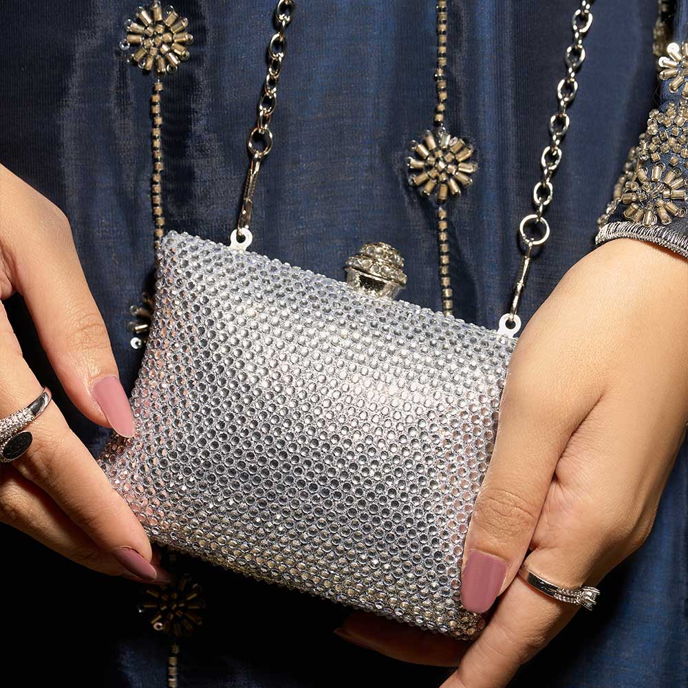 This exquisite Celestia clutch, often celebrated as an iconic evening bag, showcases a sleek rectangular silhouette. Fully adorned with rhinestones in varying shades, it radiates a soft sparkle. Elegant yet playful, it‰۪s the perfect piece to add a touch of glamour to your evening style.