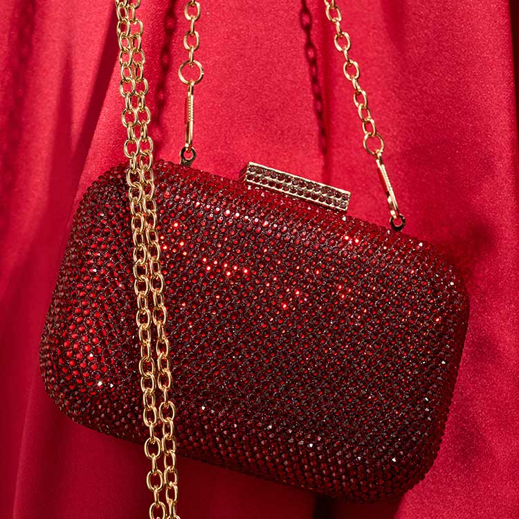 This chic clutch, crafted in a rectangular shape with softly rounded corners, dazzles with shimmering rhinestones. Paired with a sleek chain, it exudes modern elegance with a touch of regal charm. A perfect accessory to elevate evening looks with jewel-toned sophistication.