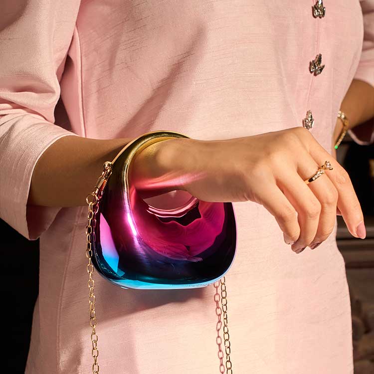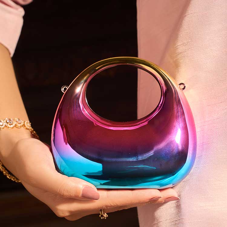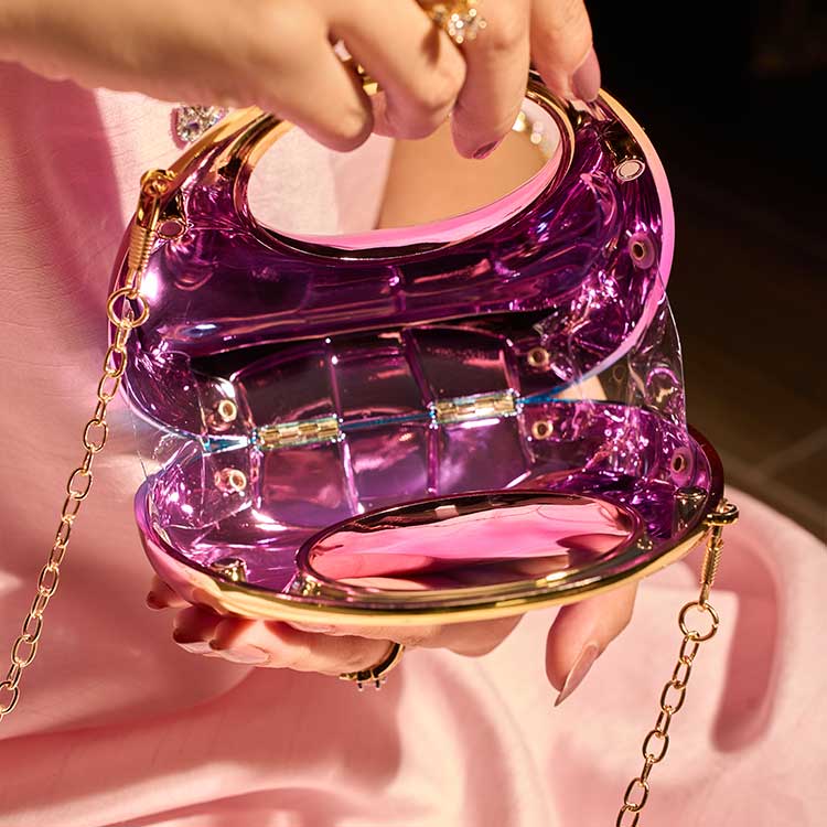 A modern acrylic clutch designed with a sleek, rounded silhouette and a glossy finish. Its smooth shine gives it a luxe, contemporary feel, while the chain adds both elegance and ease of carrying. A perfect accessory to elevate any evening look.