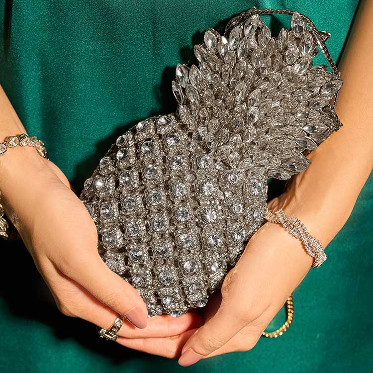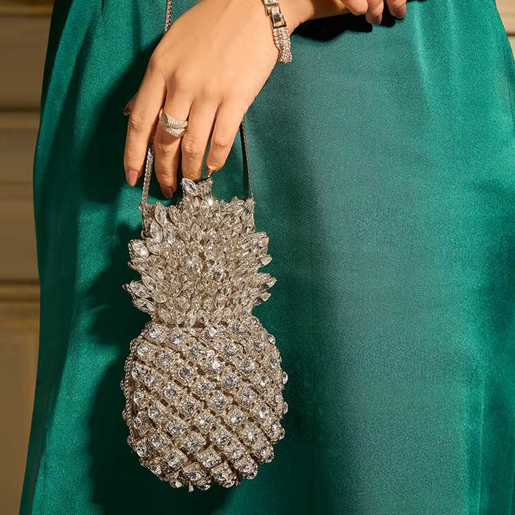 “Pinora (Silver)” is a standout clutch crafted in a chic pineapple silhouette, embellished with dazzling silver crystals that catch the light beautifully. Finished with a sleek chain for effortless wear, it blends glamour with practicality. A true head-turner, perfect for nights that call for sparkle and personality.