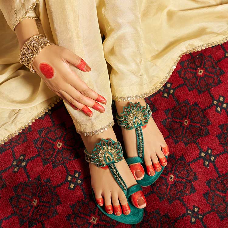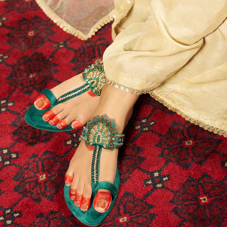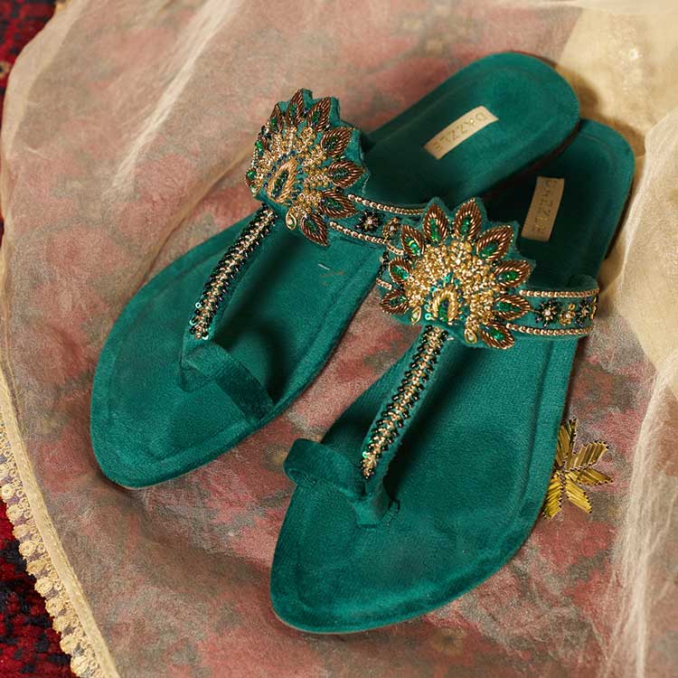 Booti kolhapuri is a masterpiece in bottle green, featuring elegant handwork and an intricately embellished flower for a refined touch. Handcrafted with precision, it blends traditional charm with modern elegance. Perfect for weddings and festive occasions.