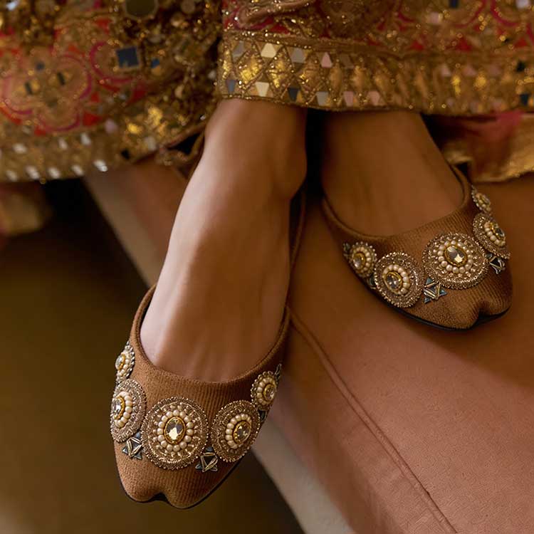 Earthy elegance meets intricate artistry in these camel-toned khussas, adorned with detailed circular embellishments and subtle shimmer. Crafted for comfort with a refined traditional touch, they’re perfect for festive wear and statement ethnic styling. Sophisticated, graceful, and effortlessly standout.