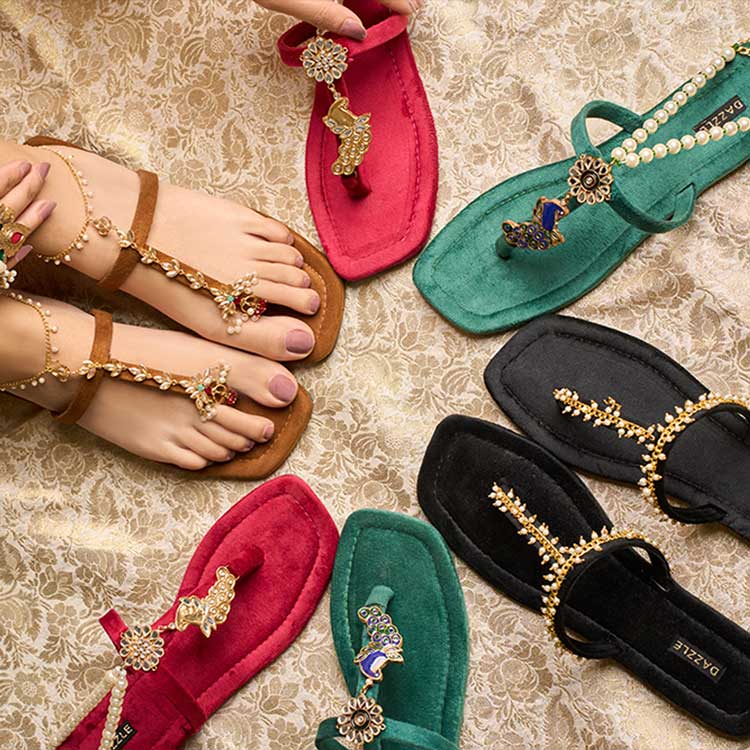 Step into elegance with Qadam. A striking black flats adorned with delicate pearl chains on the front and side straps. The perfect blend of tradition and chic, it adds a touch of glam to every step. Designed for festive flair yet comfortable enough for all-day wear.