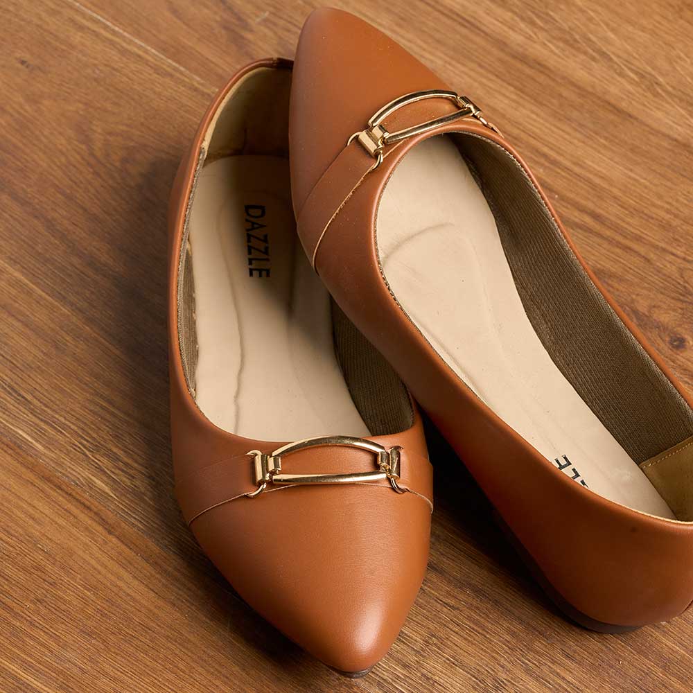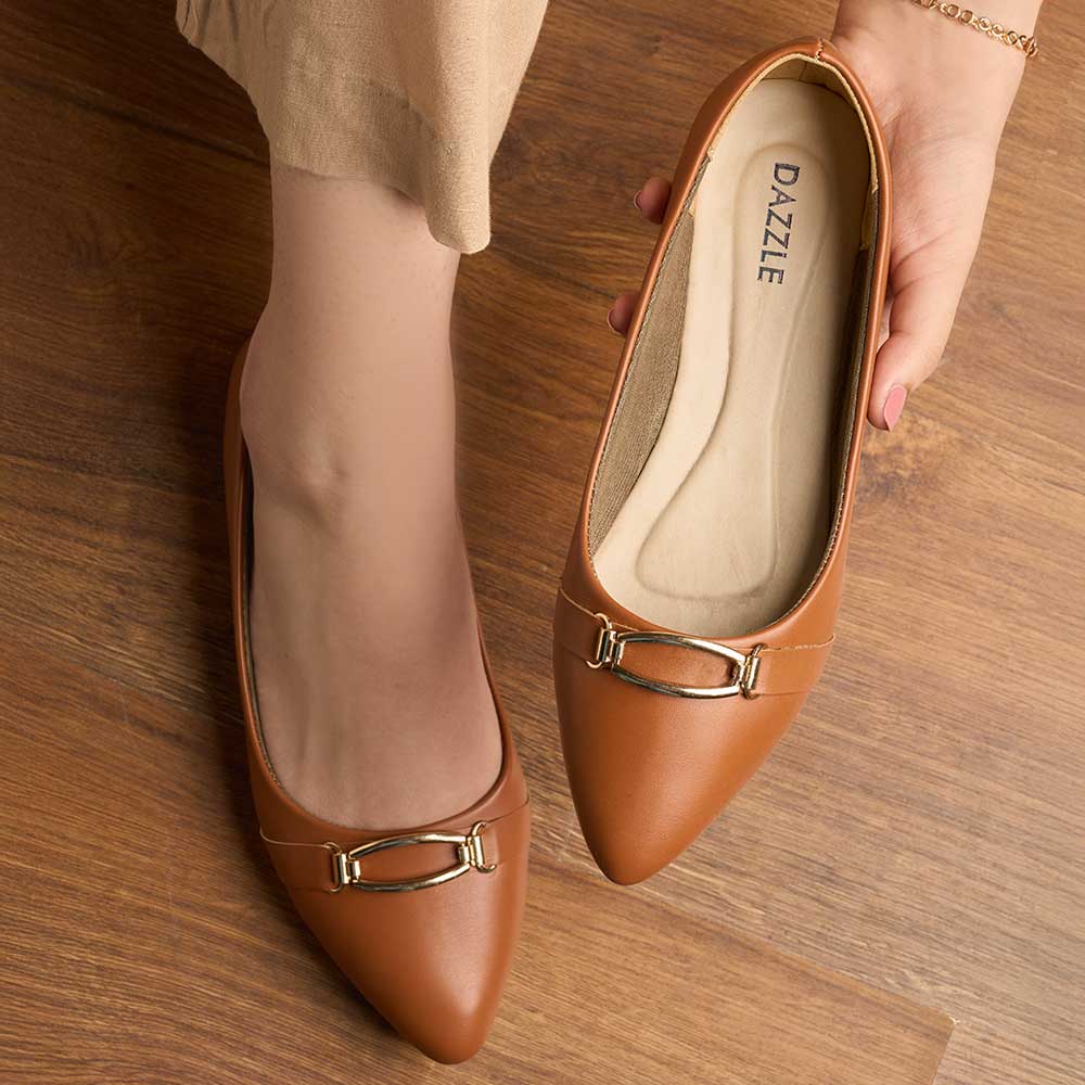 Step into effortless elegance with these polished brown flats, styled with a sleek pointed toe and a chic gold buckle accent. Designed with a soft interior and flexible sole, they offer all-day comfort without compromising on style. Perfect for everyday wear, office looks, or refined casual outfits.