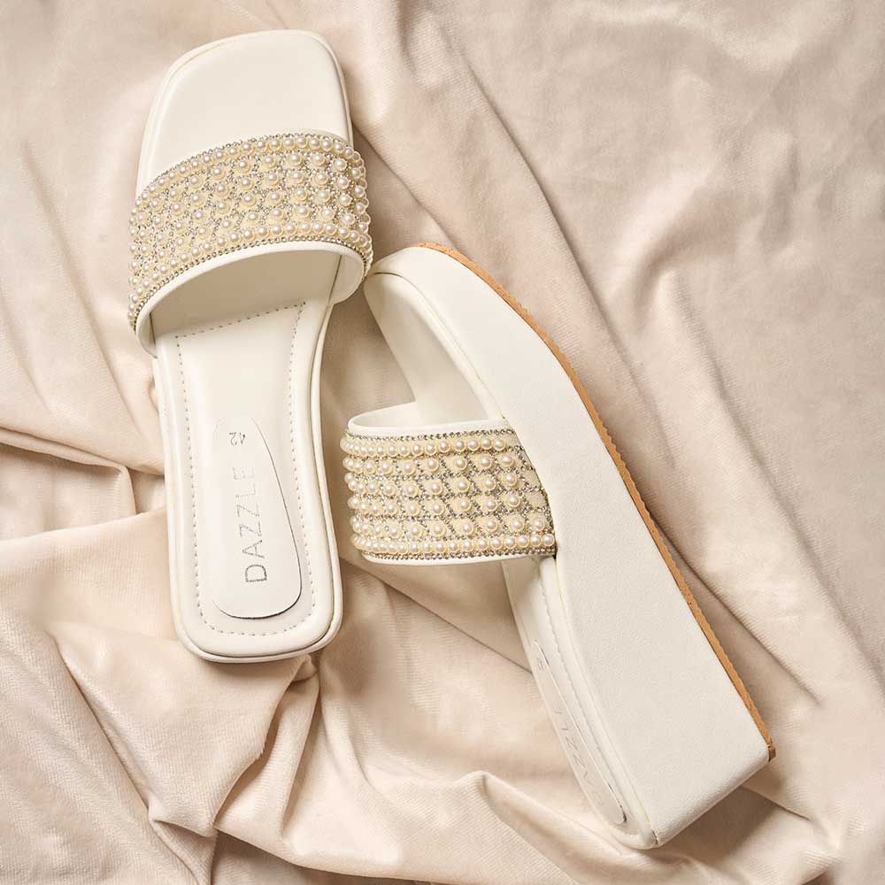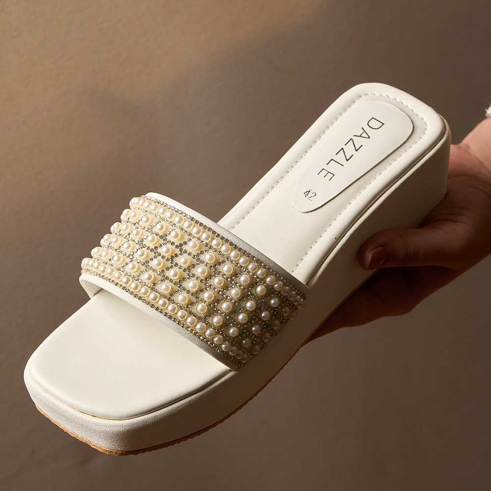 Add a touch of luxury to your look with these ivory wedges, adorned with layered pearl embellishments for a soft, luminous finish. The high cushioned platform offers comfort with height, making every step effortless and stylish. Perfect for festive wear, bridal events, and elevated everyday elegance.