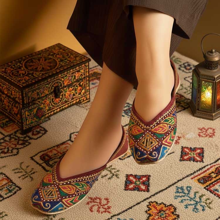 “Khushzaan” features a beautifully handcrafted upper with vibrant multi color embroidery arranged in geometric and floral-inspired patterns. The detailed thread work creates a rich, festive look, making this khussa a perfect blend of tradition and charm. The neat finishing highlights the artistry and adds to its timeless appeal.