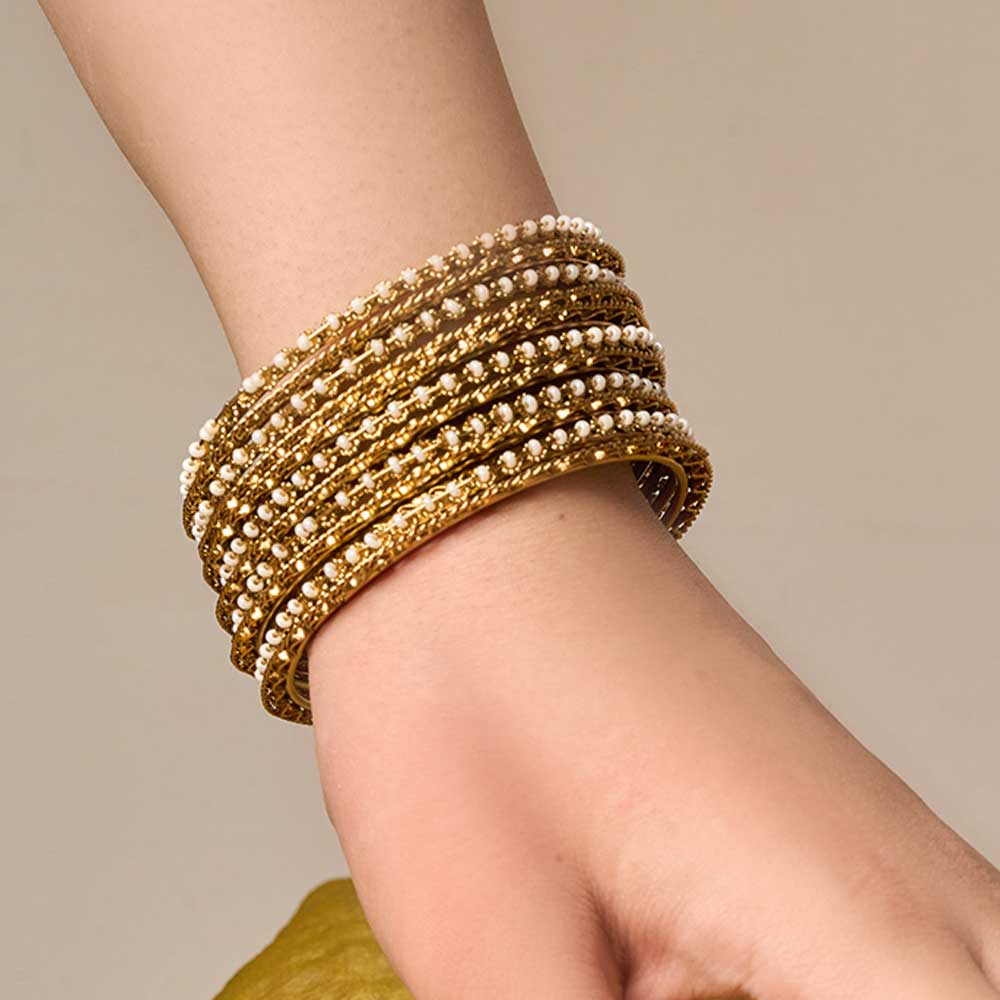 For festive and holiday wear, this chic set strikes the ideal balance between simplicity and elegance with its combination of gold bangles and one distinctive beaded bangle.