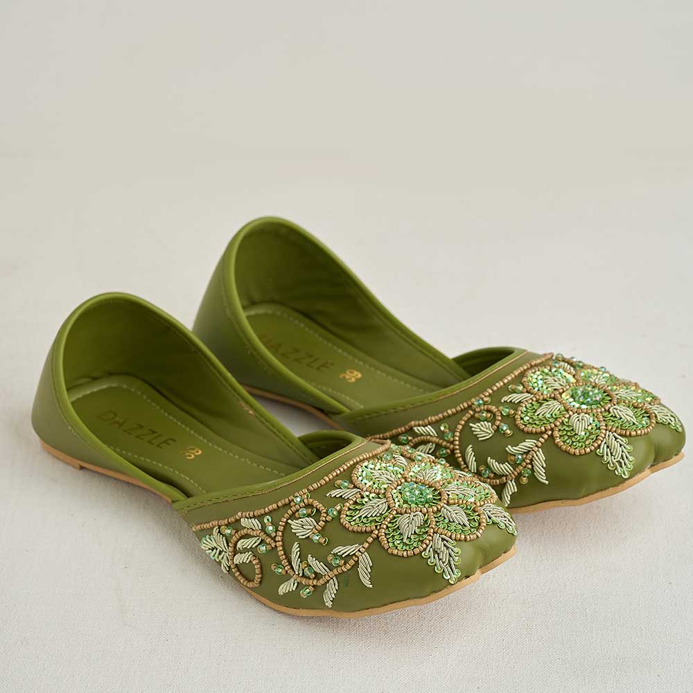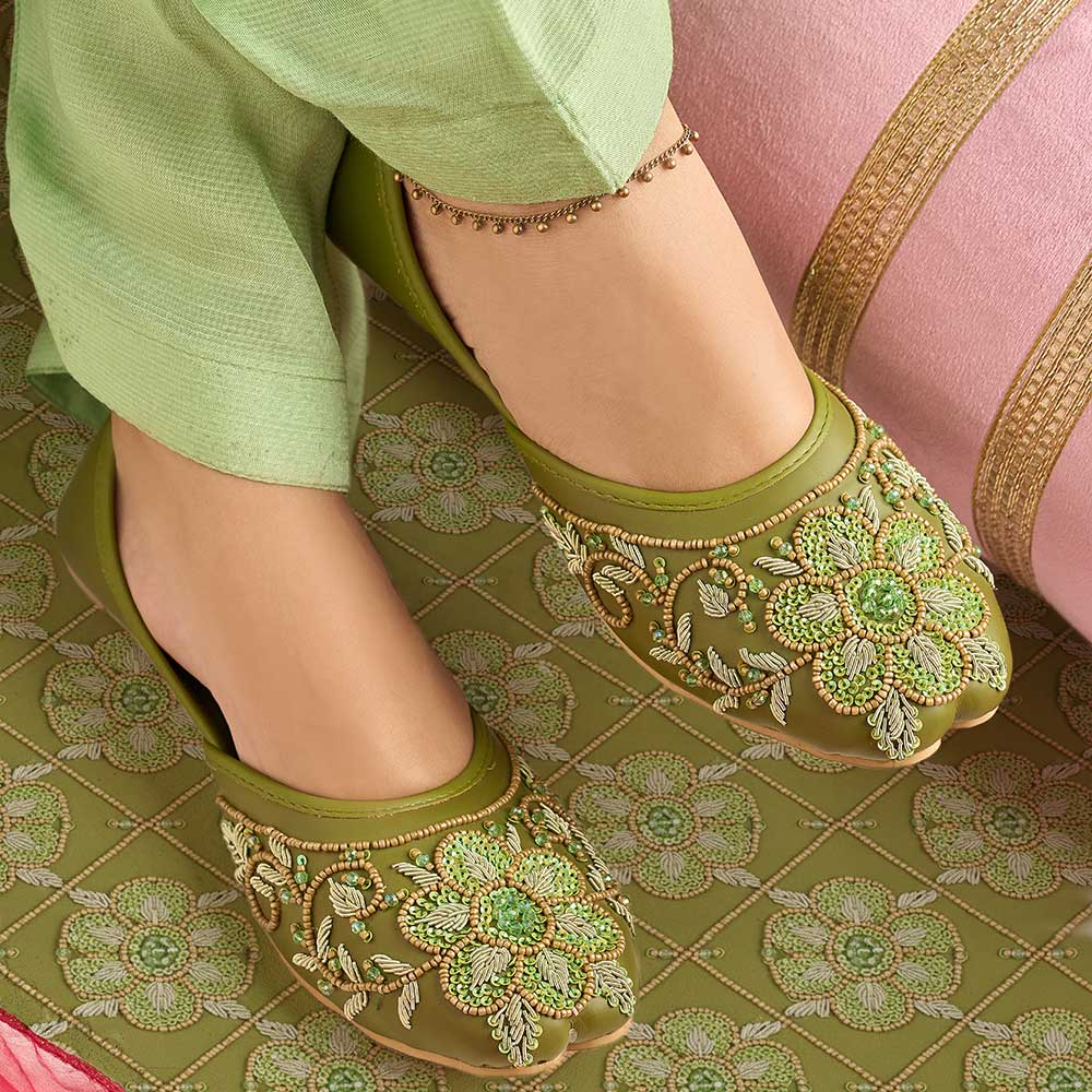 "Julia" a fresh burst of elegance. In vibrant parrot green, this pair brings life to every step with its charming embroidery and sleek faux leather finish — perfect for adding a playful yet graceful touch to your look.