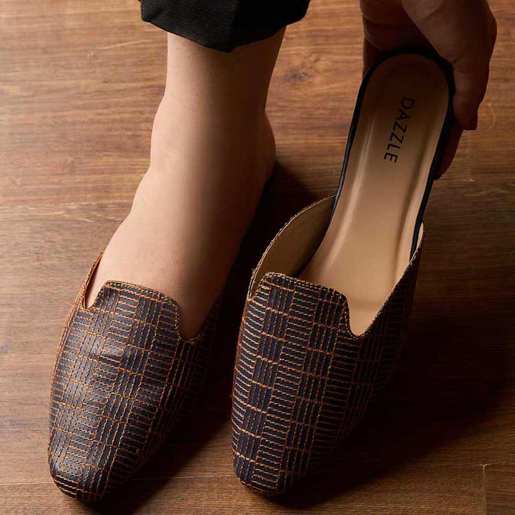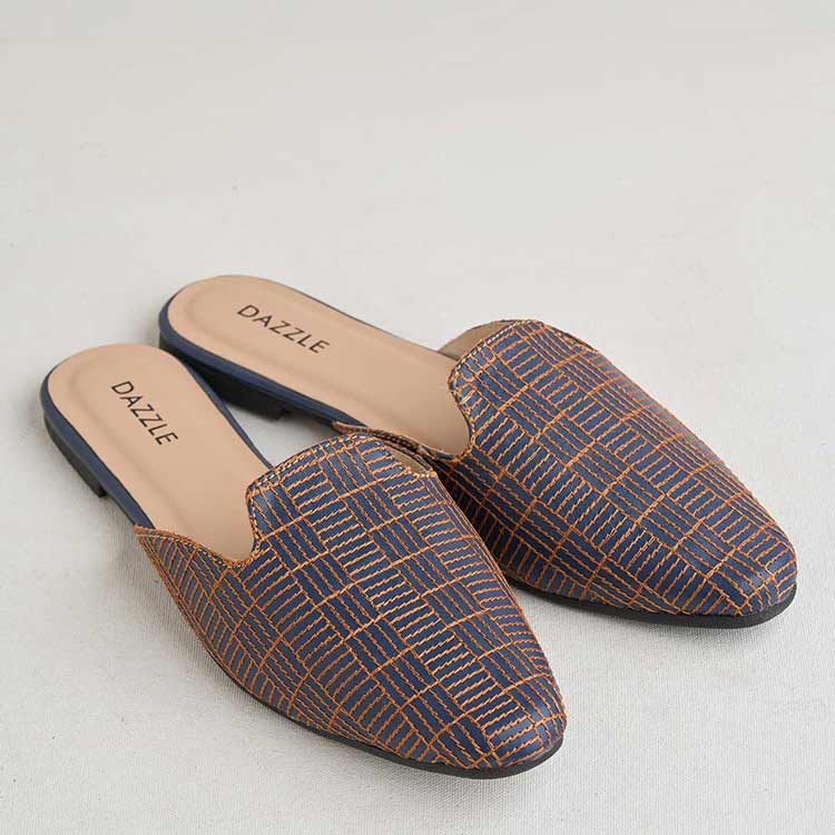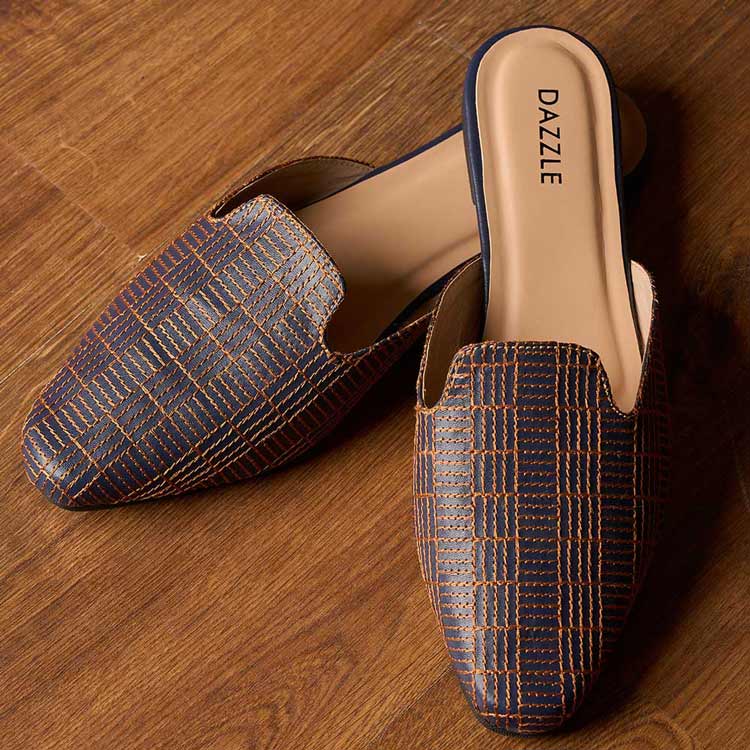 Keep it effortlessly stylish with these navy-brown embroidered mules, featuring a sleek slip-on design and a contemporary stitched pattern. Their cushioned insole ensures all-day comfort, making them perfect for both casual and semi-formal looks. A smart blend of comfort, craft, and everyday elegance.