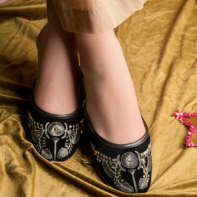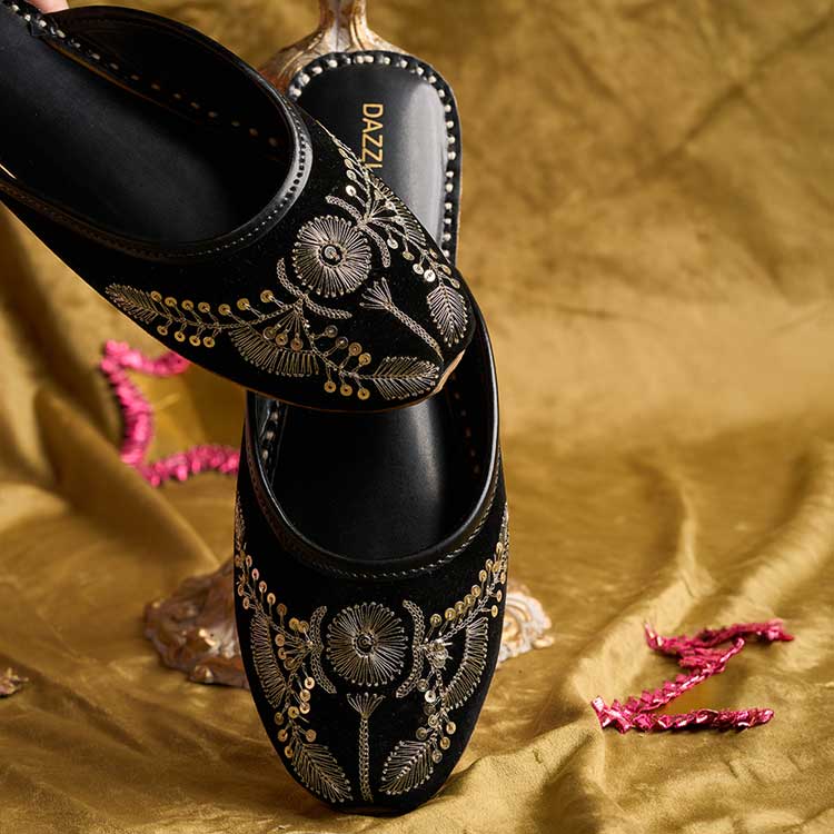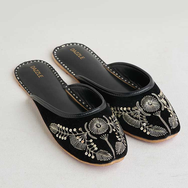 Make a statement with this stunning black, backless khussa, adorned with intricate floral embroidery in shimmering gold tones. Its velvety finish and fine craftsmanship bring a regal charm to every step. Perfect for festive occasions, evening wear, or anytime you want effortless sophistication.