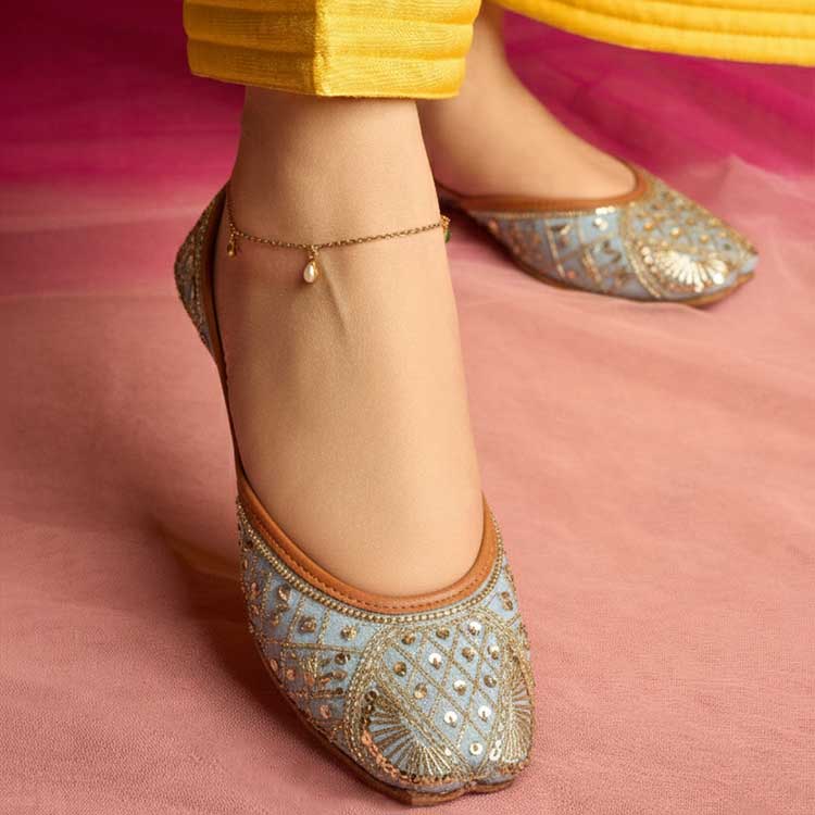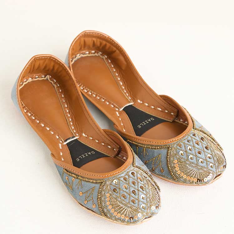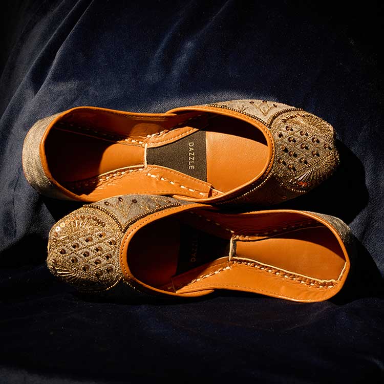 “Ferozeh” comes in a soft grey tone, beautifully detailed with intricate golden embroidery and delicate bead accents across the upper. The ornate patterns add a refined sparkle, making this pair a timeless and graceful choice for festive and formal looks.