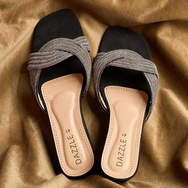 Add a touch of luxe to your look with these black slides, featuring intricately woven silver beadwork that catches the light beautifully. The modern square toe and cushioned base offer comfort without compromising style. Perfect for festive nights, parties, or elevating your everyday outfits with effortless sparkle.