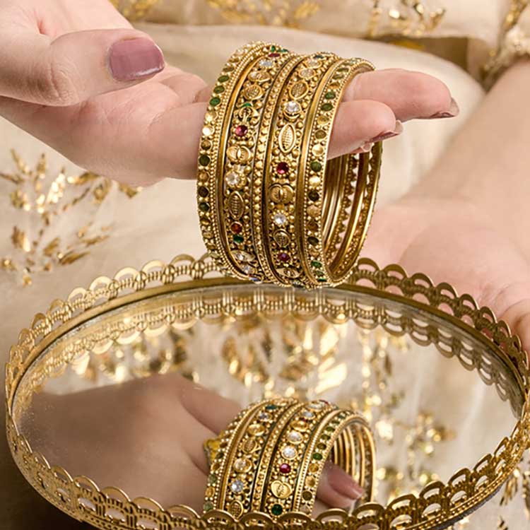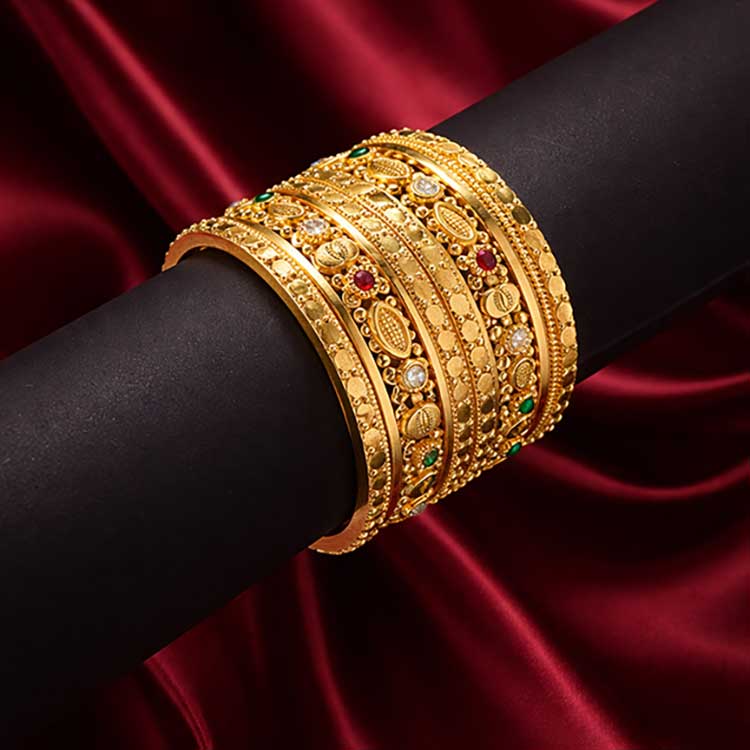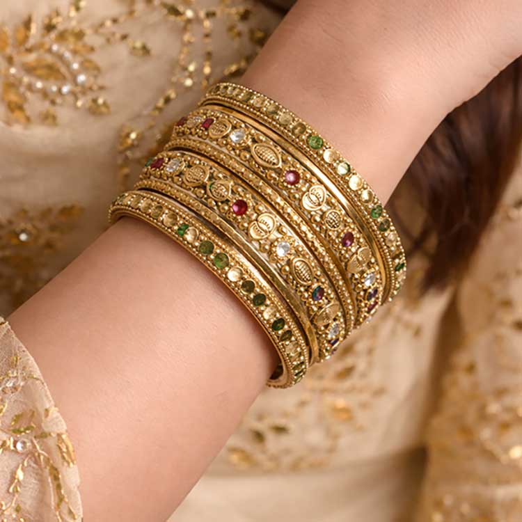 Opulent gold-tone bangles adorned with intricate embossed patterns and vibrant multi color stone accents. A perfect blend of traditional craftsmanship and regal charm, ideal for weddings and festive celebrations.
