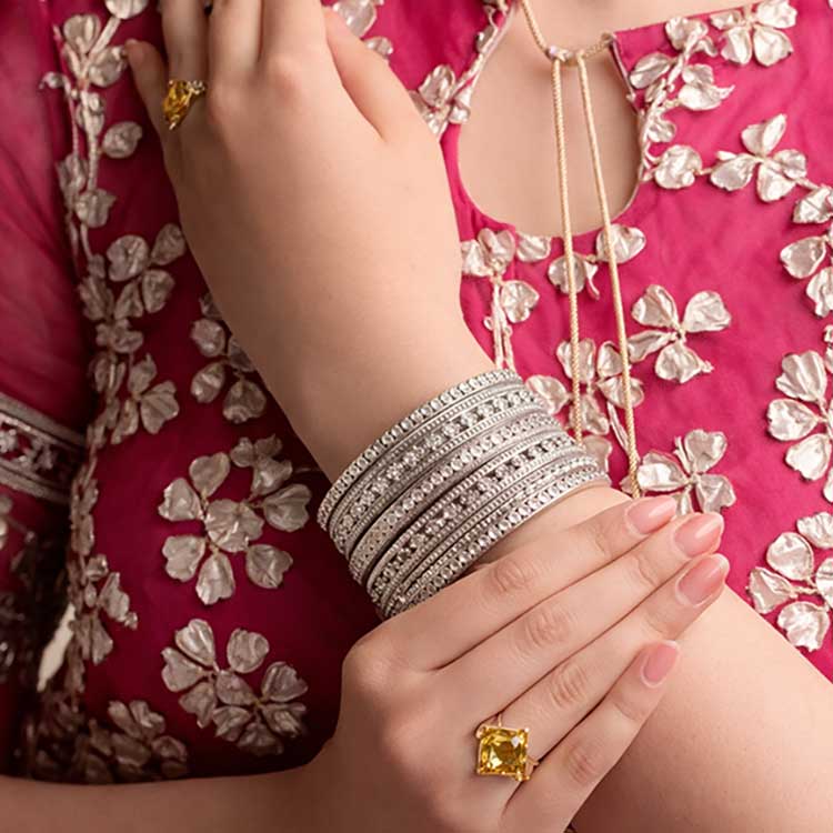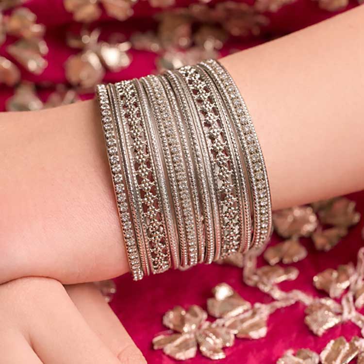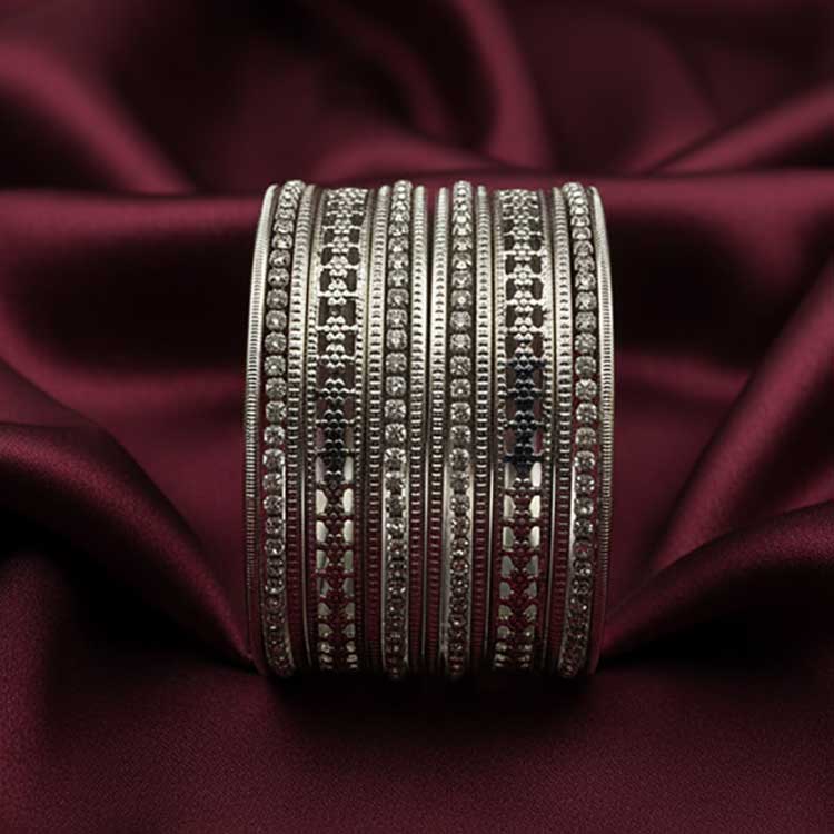 Elegant oxidized bangles featuring fine linear detailing and shimmering stone accents throughout. Their sleek, stacked look adds a bold yet graceful touch, perfect for elevating both festive and contemporary outfits.