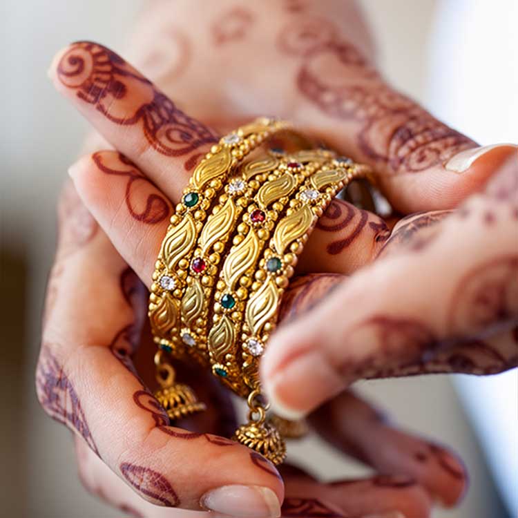 Luxuriously detailed gold-tone bangles adorned with intricate filigree work and subtle stone embellishments. Designed to shimmer with every movement, these bangles bring a rich, traditional elegance perfect for weddings and festive occasions.