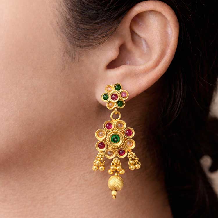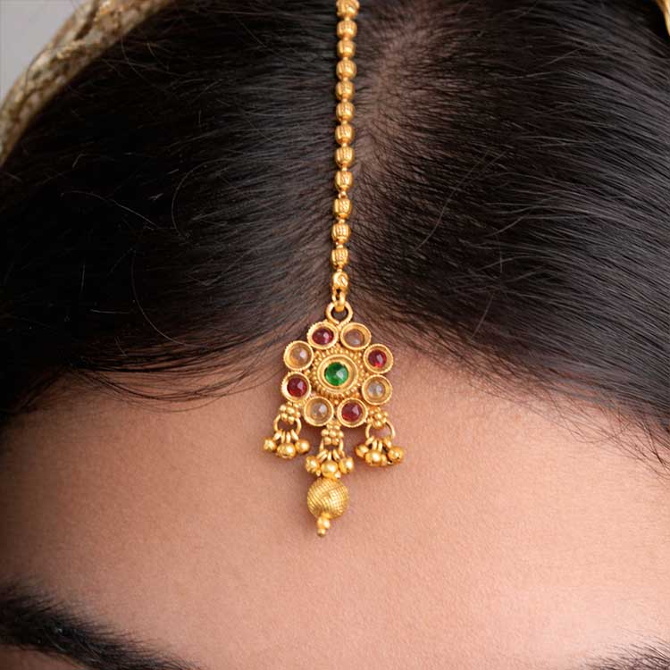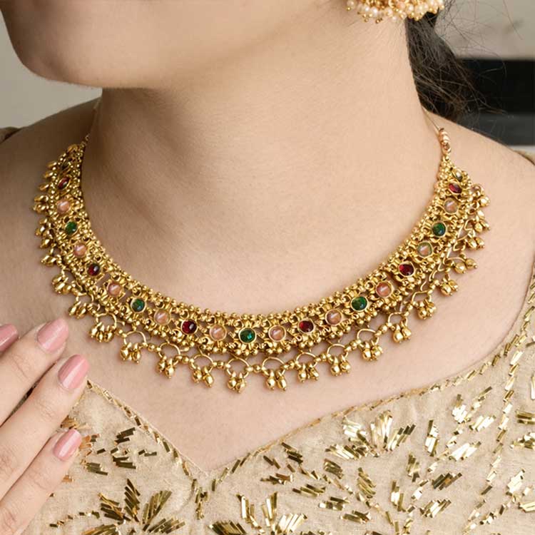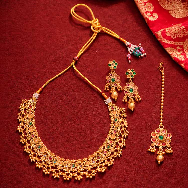 Elegant and festive, this gold-toned jewellery set features a delicately detailed choker paired with matching earrings and a coordinating bindiya. Adorned with colorful stone accents and graceful dangling elements, it brings vibrant charm and traditional beauty to any look. Perfect for weddings, mehndi, and celebratory occasions.