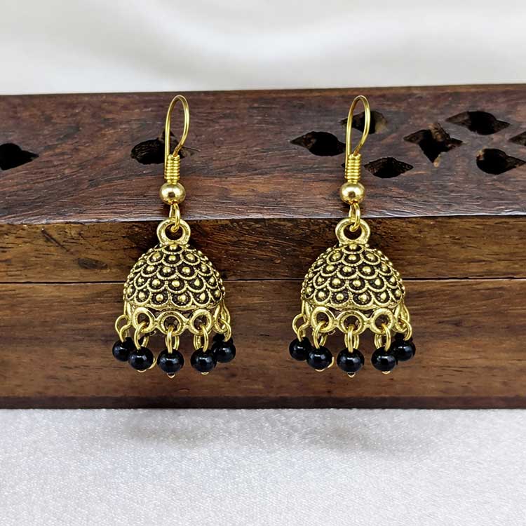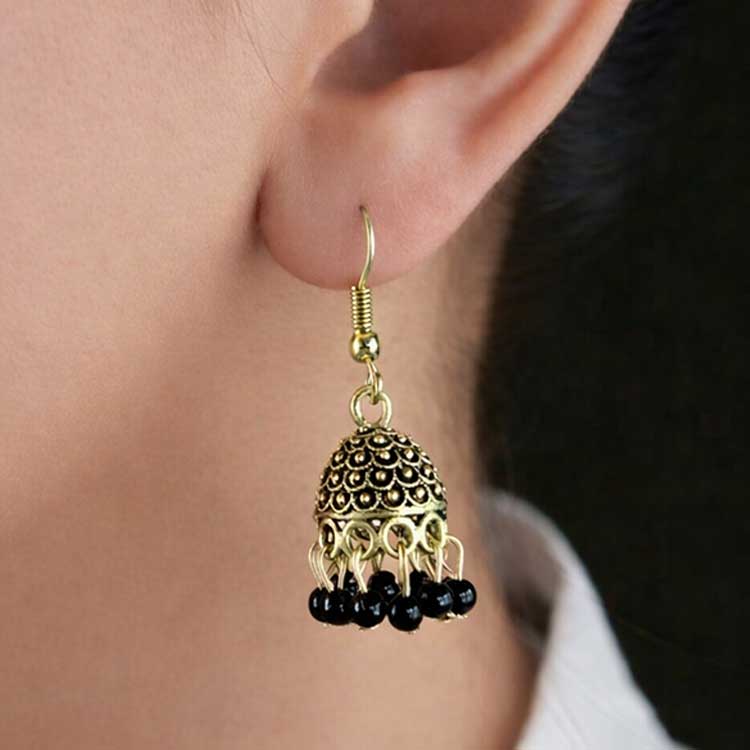 Striking and elegant, these antique-gold jhumka earrings feature intricately carved domes with delicate black bead drops for a bold traditional touch. Designed to sway with every step, they add depth, charm, and vintage allure to festive and ethnic looks. Perfect for celebrations and statement styling.