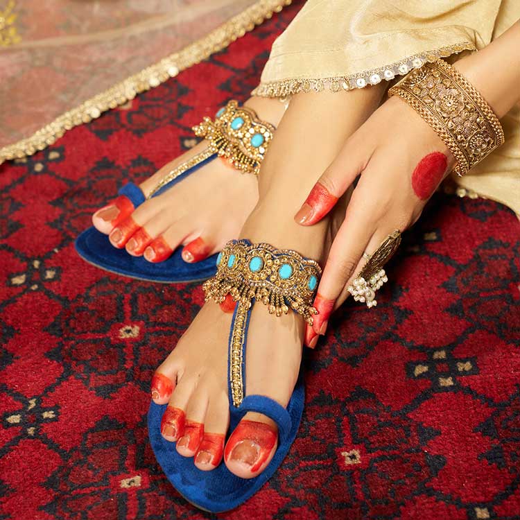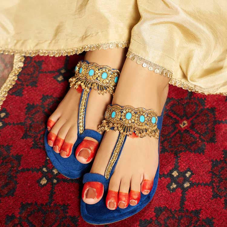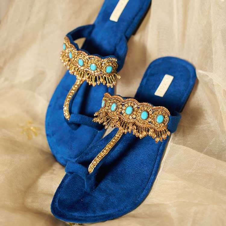 The Maina kolhapuri features a deep navy blue base, adorned with fine handwork, intricate embellishments, and elegant tassels for a rich, artistic look. Handcrafted with attention to detail, it brings together tradition and contemporary elegance. Perfect for weddings and festive occasions.