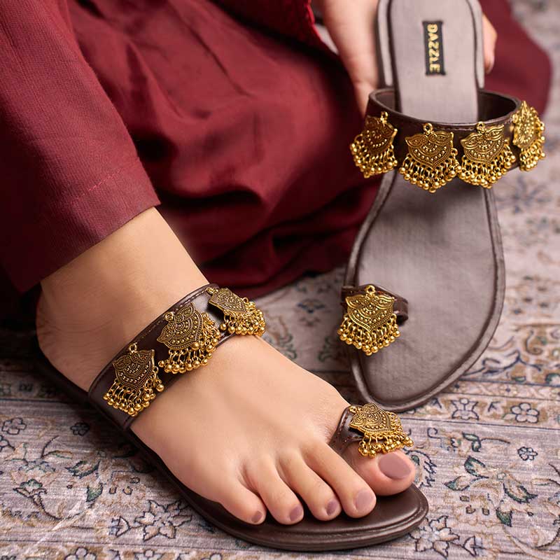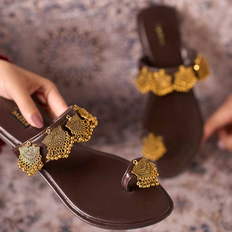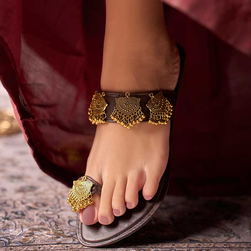Inspired by our most loved ornaments khussas, we bring you now our Kolhapuri edition, with the elaborate metal arch motive ornaments along with dangling small hangings. They are a unique addition to your summer wardrobe collection because of its rich color and soft, cushioned sole, which provides comfort. and distinct appeal.