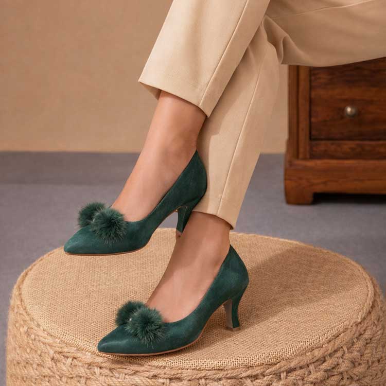 Chic and captivating, “Morphia” kitten heels feature a rich teal blue accented with a plush fur embellishment for a touch of luxe drama. Designed to blend comfort with statement style, they add effortless elegance to both casual and dressy looks. Bold, modern, and irresistibly stylish.