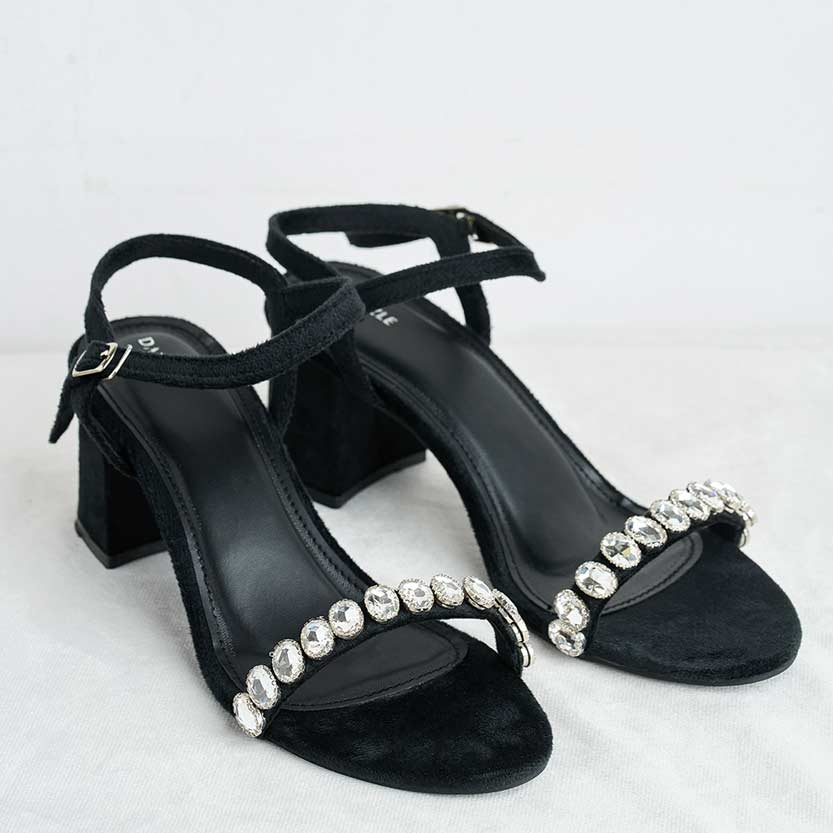 The Ghoonghat formal heel features a classic black color with sparkling stone work on a single strap. Elegant and comfortable, it's perfect for weddings, parties, and special occasions.