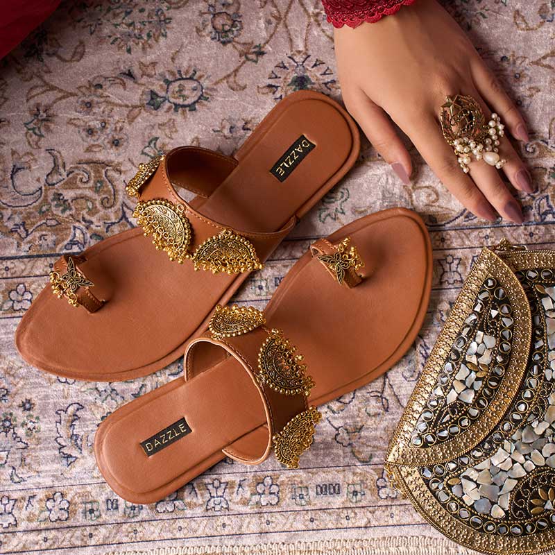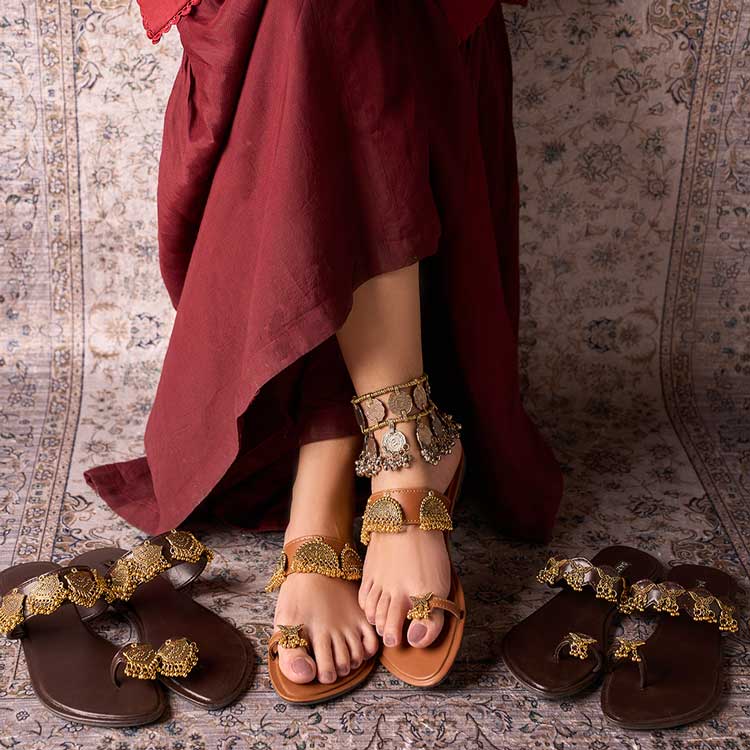 Inspired by our most loved ornaments khussas, we bring you now our Kolhapuri edition, with the elaborate D-shape metal ornaments with the tint of butterfly on thumb. They are a unique addition to your summer wardrobe collection because of its rich color and soft, cushioned sole, which provides comfort. and distinct appeal.