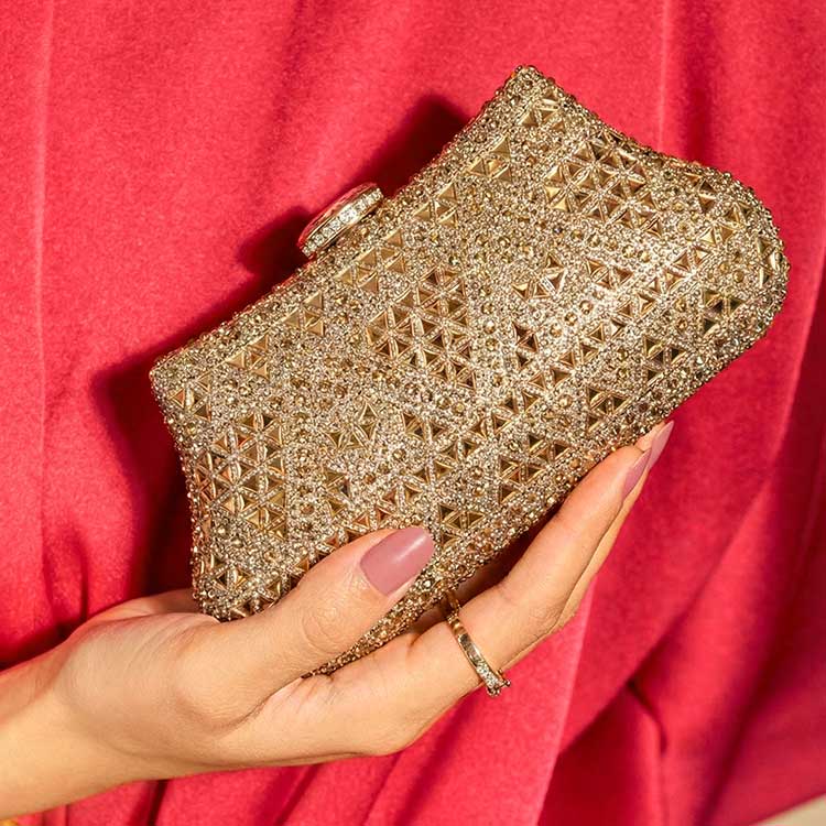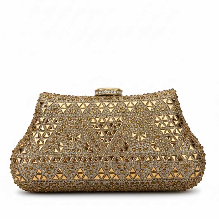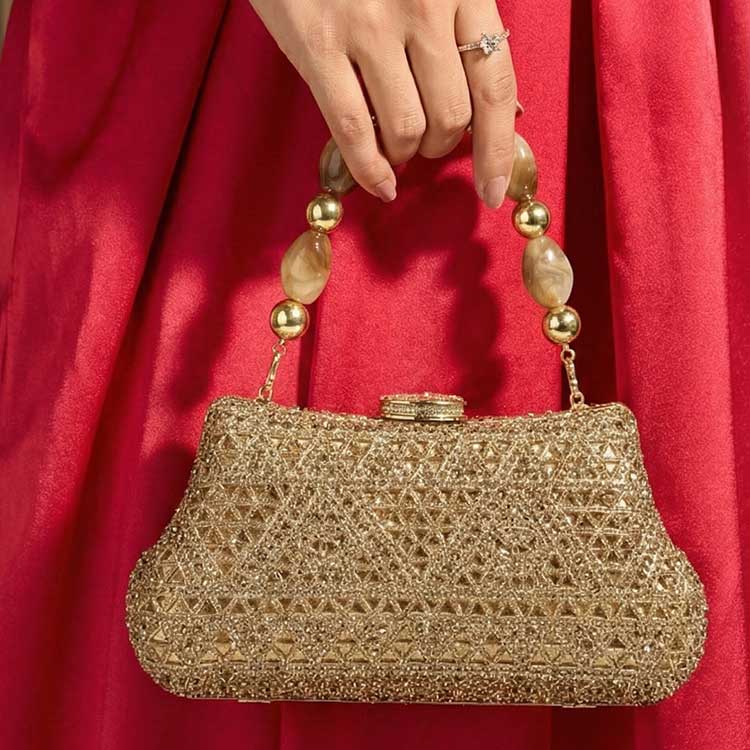 A shimmering gold clutch covered in geometric crystal detailing that sparkles from every angle. It comes with a chic handle adorned with marble-style beads with a separate chain attached to it for an elegant touch. Perfect for adding instant glamour to weddings and evening events.