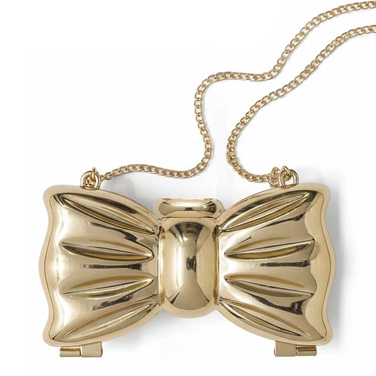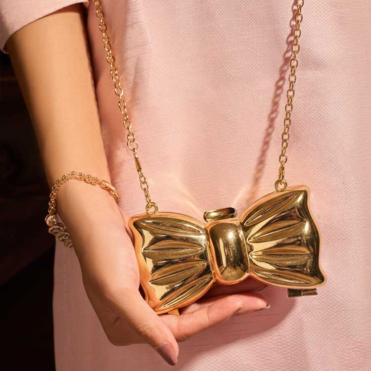 A luxe golden bow-shaped clutch that shines with every angle. Comes with a sleek golden chain and a built-in mirror for quick touch-ups. The perfect statement piece for any glam look.
