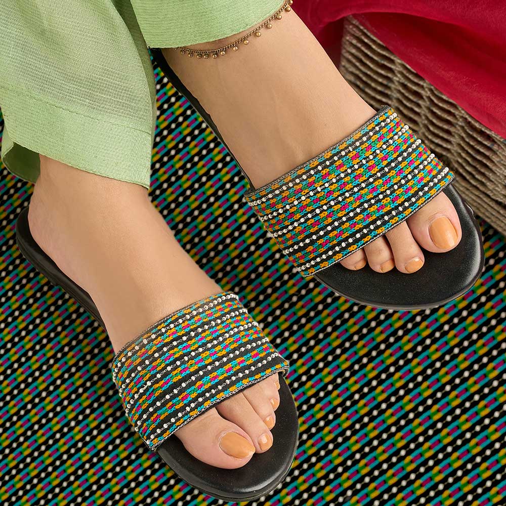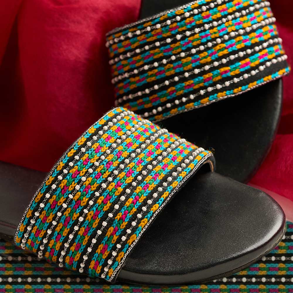Add a playful twist to your look with “Claudia” a chic multi-colored slider crafted from suede velvet. Its beaded strap design brings effortless charm and comfort, perfect for casual days with a stylish edge.