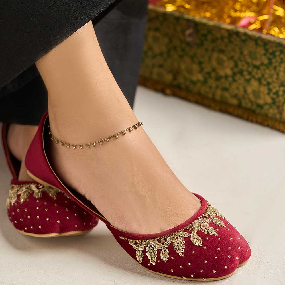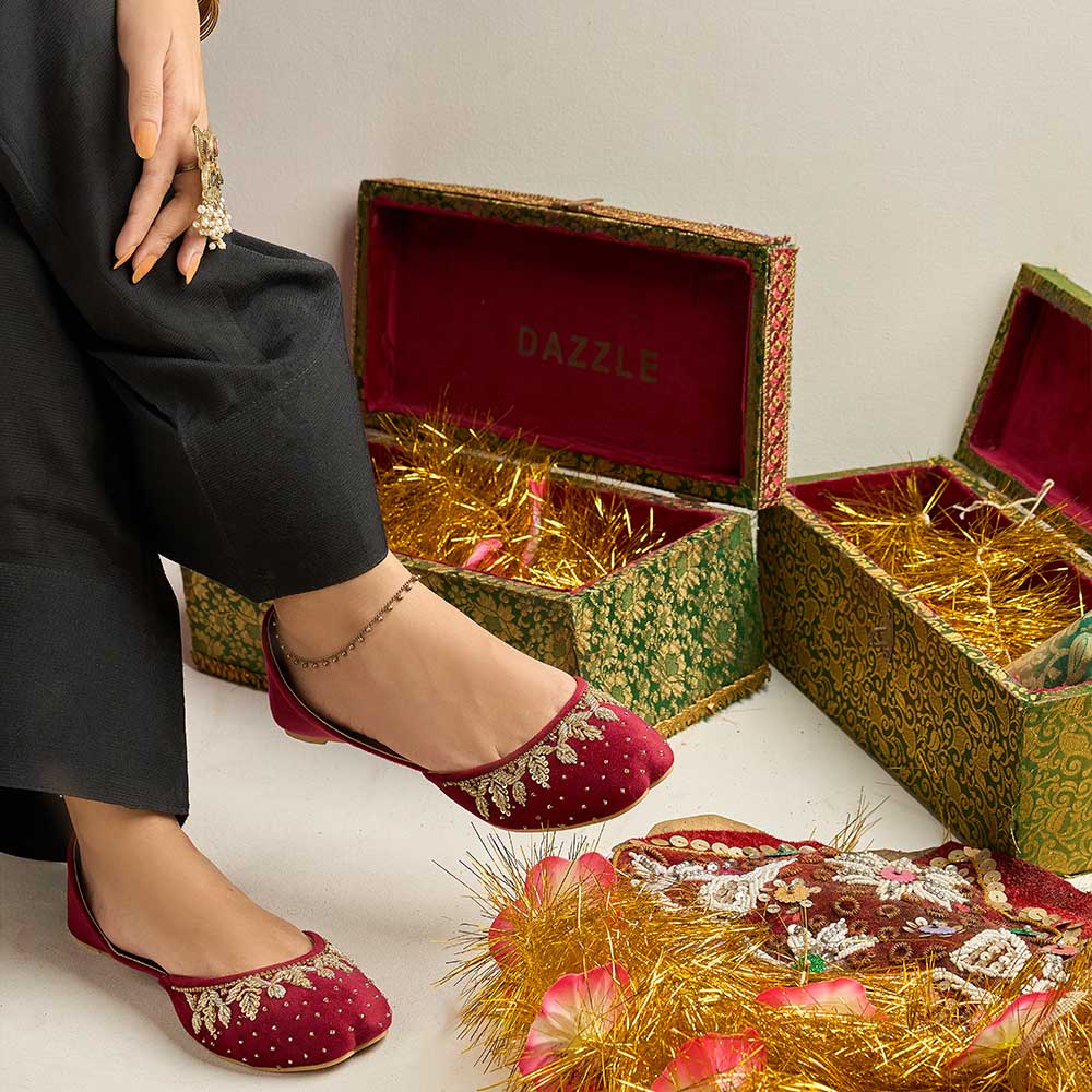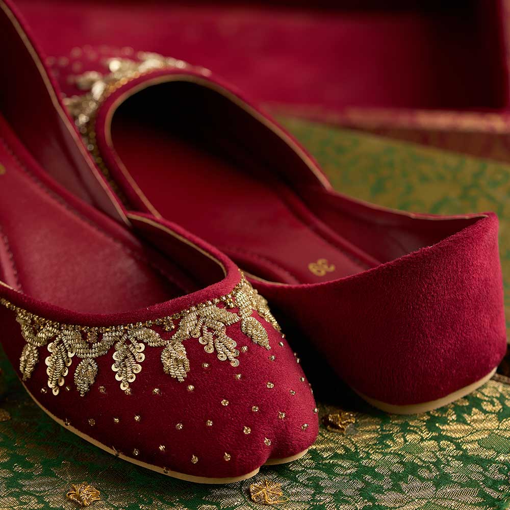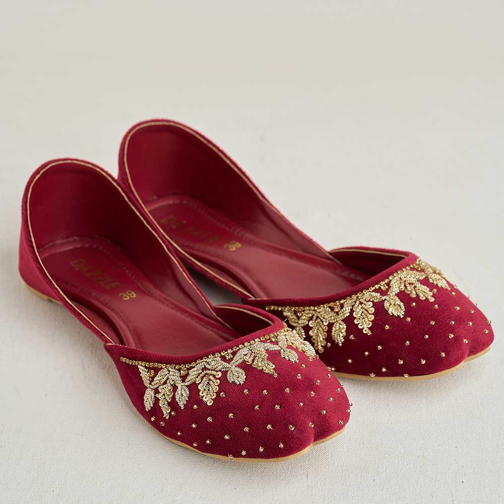 Add a touch of regal color to your look with the stunning Erica khussa. Featuring a rich maroon velvet and exquisite handwork, this khussa ensures elegance and comfort with a soft leather lining and a reliable non-slip sole.