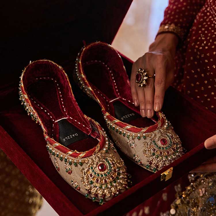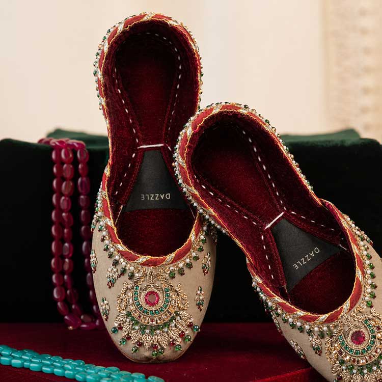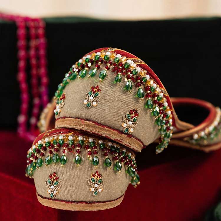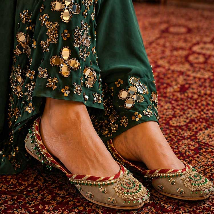 Breathtakingly opulent, these khussas are encrusted with elaborate mirror, emerald, and ruby-toned jewel embroidery that looks like wearable royal jewelry. A true heirloom piece crafted for the one who deserves nothing less than pure magic on her most special day.