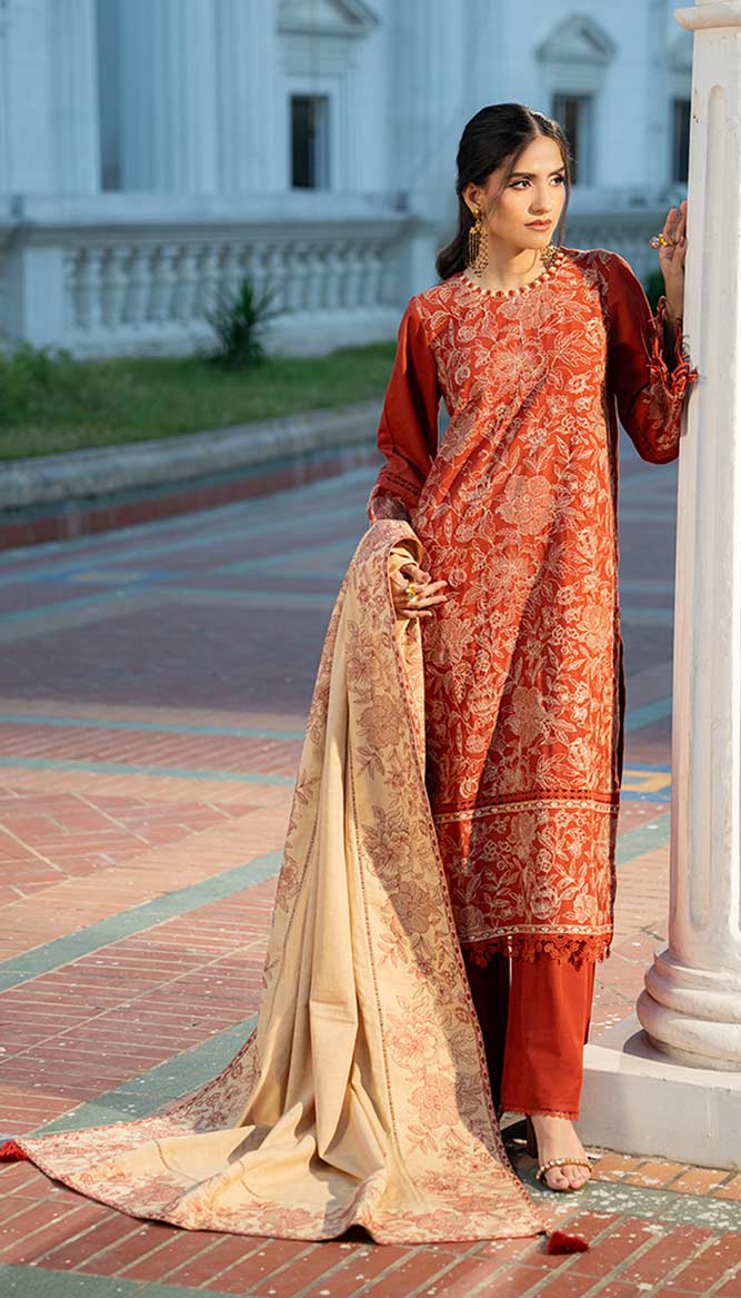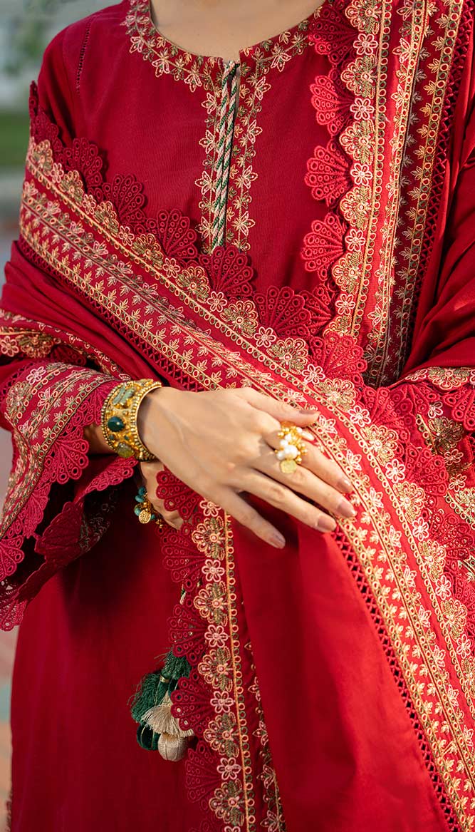 Embrace elegance with Mahjabeen, a rich maroon three-piece khaddar set featuring delicate tassels on the neckline and intricate multihead embroidery along the front. Paired with a culotte and matching dupatta, this outfit blends tradition with a chic, modern edge perfect for the season.