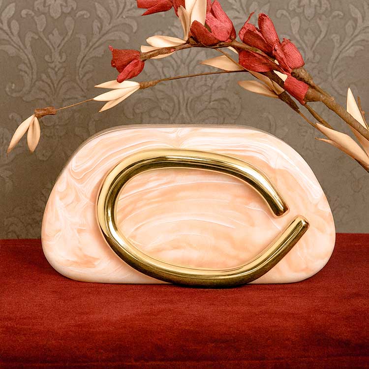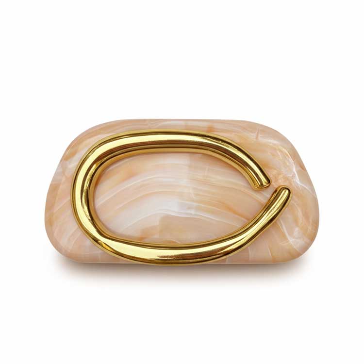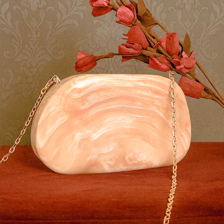 “Marbella” blends modern elegance with sculptural charm. Featuring a glossy marble-finish base paired with a sleek gold handle, it’s designed to stand out and also comes with a chain while staying effortlessly chic. A perfect statement piece for evenings when subtle luxury says it all.
