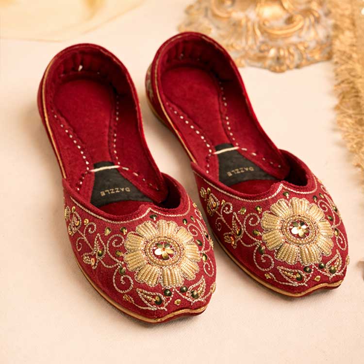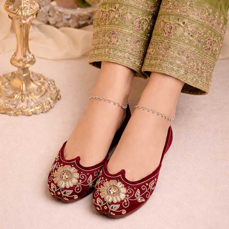 Luxurious maroon velvet khussas adorned with intricate gold embroidery and a statement floral embellishment. Rich, regal, and elegant, these crafted khussas are perfect for weddings and festive occasions.