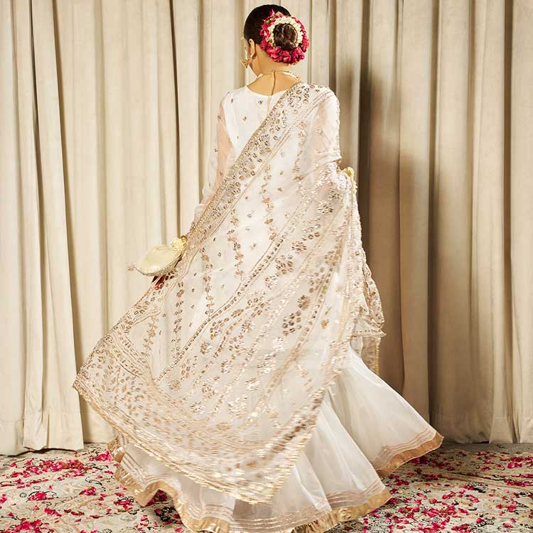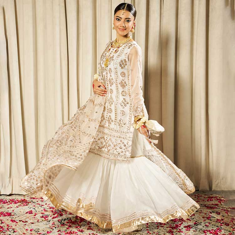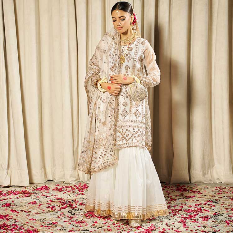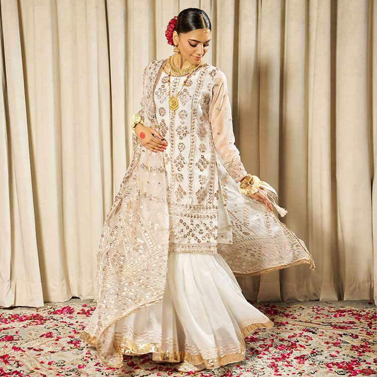Noorain a luminous Nikah bridal creation in sheer organza, featuring an off-white shirt and gharara delicately embellished with rose gold gotta work. The dupatta, finished with classic kiran detailing all over, adds a touch of traditional finesse. Radiating grace and purity, Noorain is a timeless choice for the Nikah bride, beautifully blending heritage with ethereal charm.