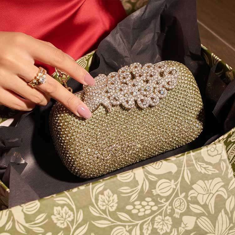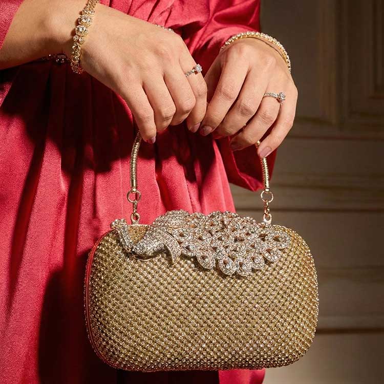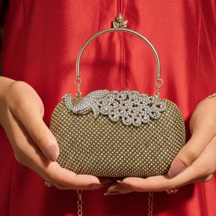 “Peacora” is a dazzling statement piece crafted to steal the spotlight. Adorned with shimmering crystals and a graceful peacock-inspired motif, it radiates festive luxury and regal charm. Perfect for weddings and celebrations where glamour is a must.