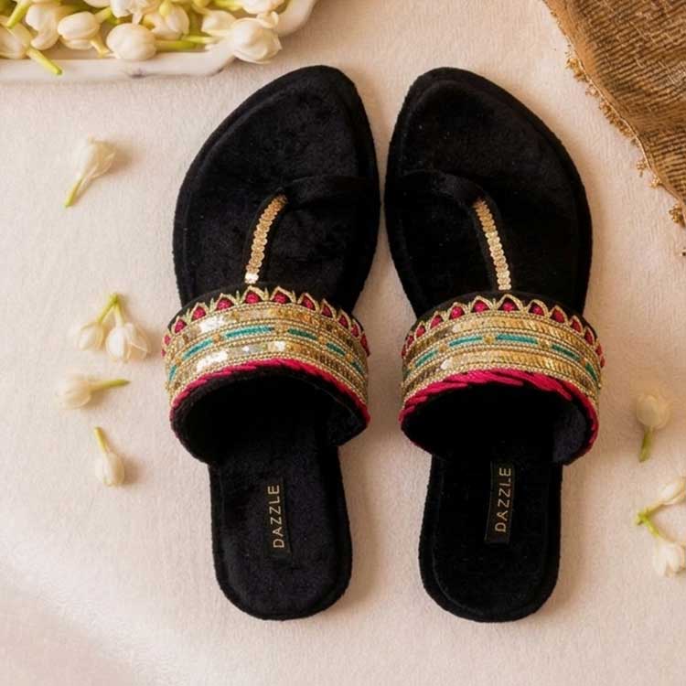Striking black flat kolhapuri wrapped with vibrant multicolor and gold embroidered straps that bring a bold and festive traditional flair to any ethnic outfit. Eye-catching, unique, and full of cultural charm — the perfect pairing for a beautiful look.