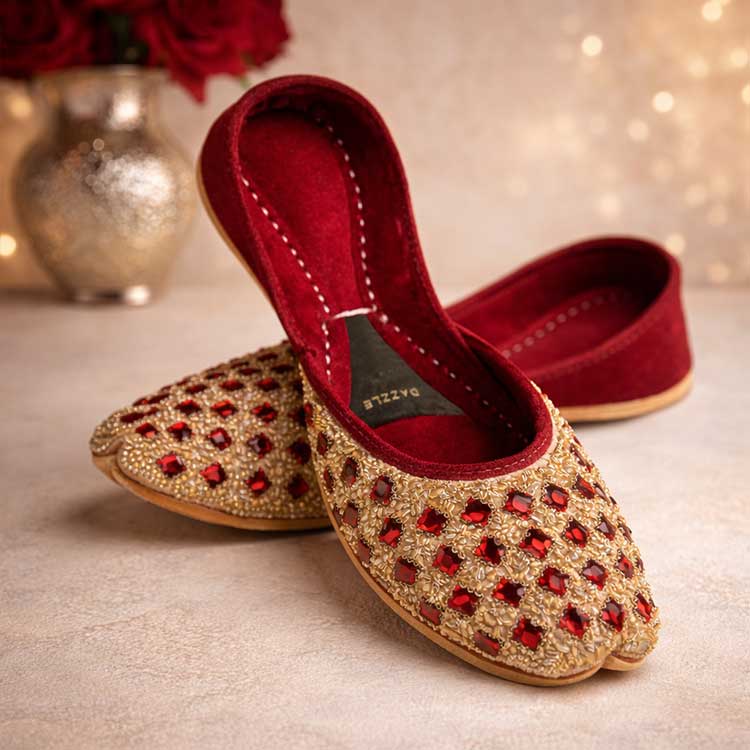 Traditional handcrafted khussas adorned with vibrant maroon stones and delicate detailing. Elegant yet comfortable, these timeless khussa perfectly complement festive and ethnic ensembles.