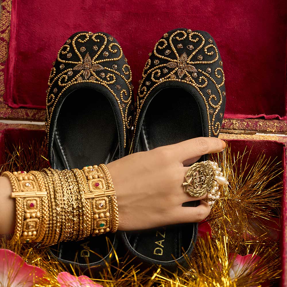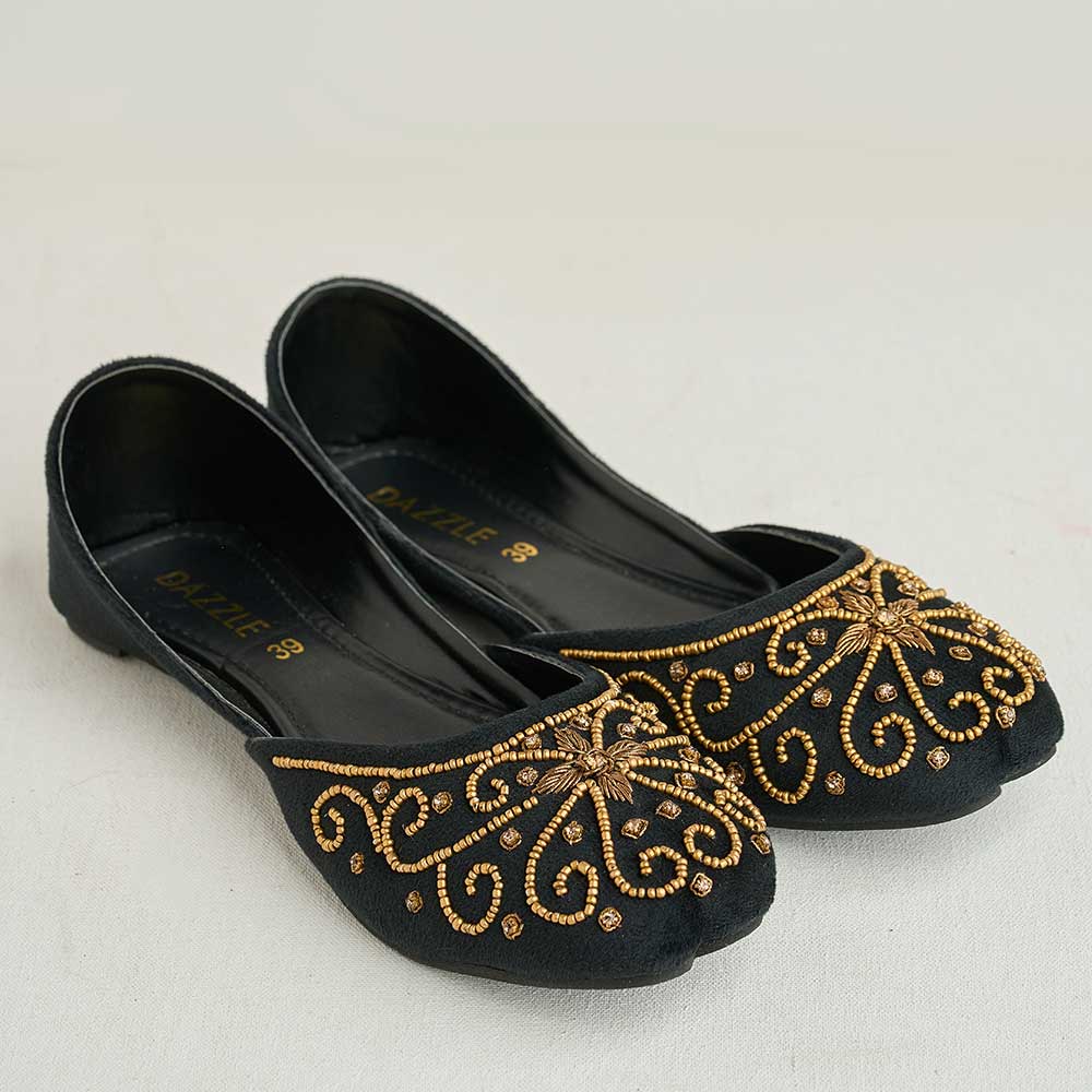 Make a bold statement with “Spiral” a black velvet pair beautifully detailed with golden swirl embroidery. Chic, comfortable, and timeless — perfect for adding a touch of glam to any outfit.
