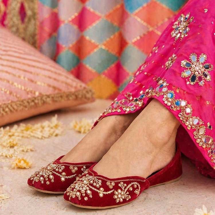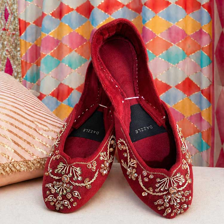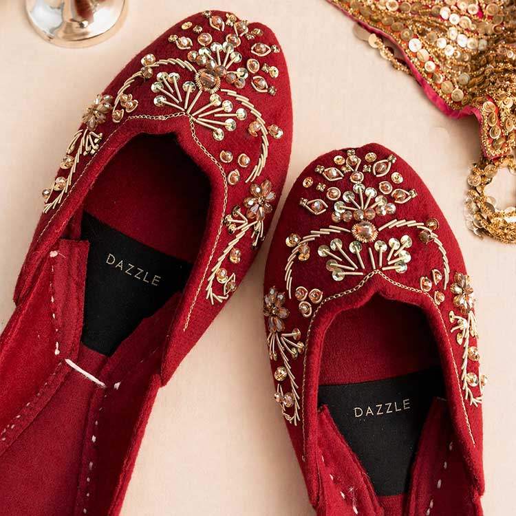 Rich maroon velvet khussa beautifully embroidered with delicate gold floral and leaf patterns that spread across the surface like a blooming garden in full glory. Festive, elegant, and deeply romantic — a perfect eid or wedding guest shoe that pairs beautifully with any traditional outfit.
