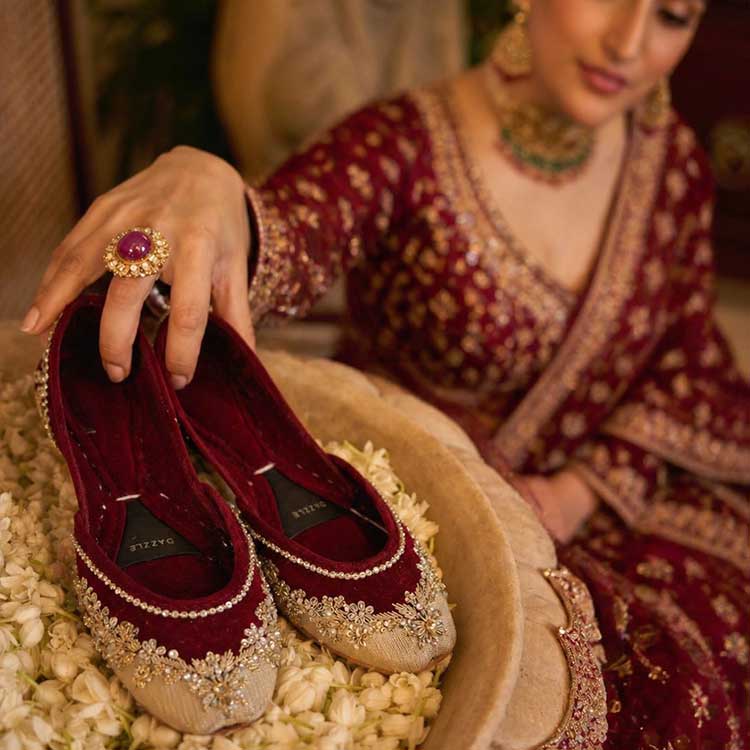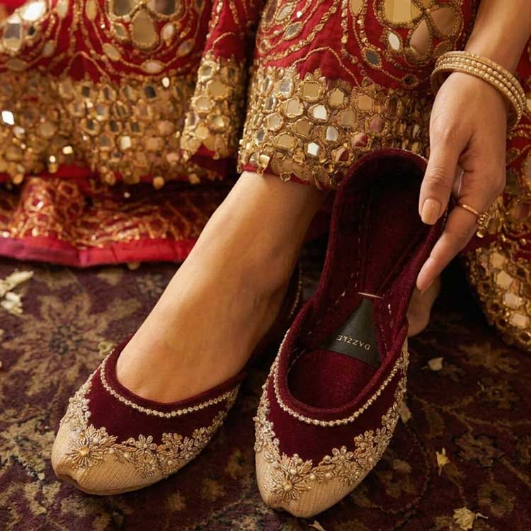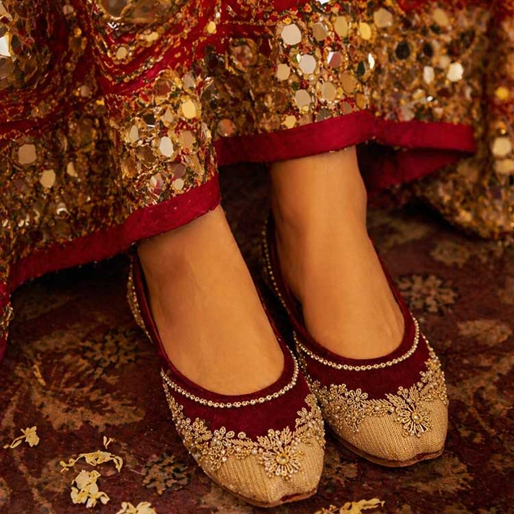 Luxurious deep maroon velvet khussa elegantly trimmed with stunning gold and pearl floral embroidery at the toe that gives them a rich and regal bridal beauty. Deeply romantic and timelessly classic, these are the perfect shoes for a bride or wedding guest who wants to look absolutely exquisite.