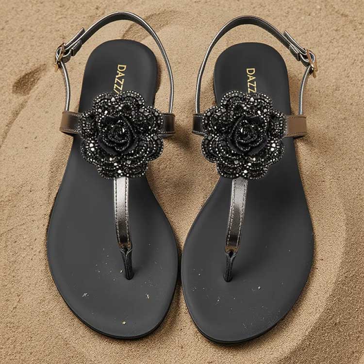 Bold and glamorous, these sleek black sandals feature straps adorned with statement beaded rose brooches. Designed to add dramatic sparkle with a modern edge, they’re perfect for evening outings and elevated festive looks. Striking, chic, and effortlessly powerful.