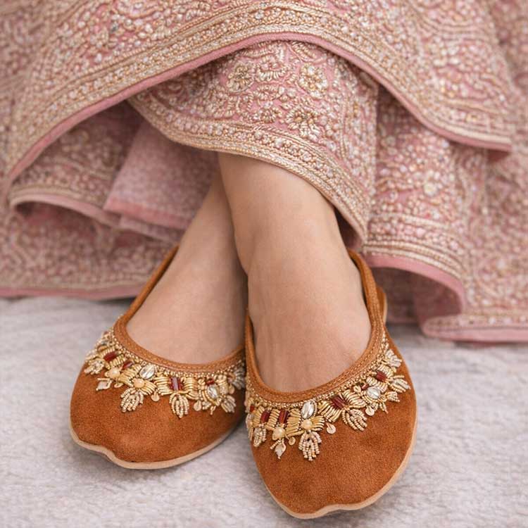 Warm and radiant, this rust-toned khussa is adorned with delicate floral embellishments and soft pearl accents for a graceful festive touch. Crafted for comfort with timeless traditional charm, it’s perfect for weddings, celebrations, and elegant ethnic looks. Feminine, vibrant, and effortlessly beautiful.