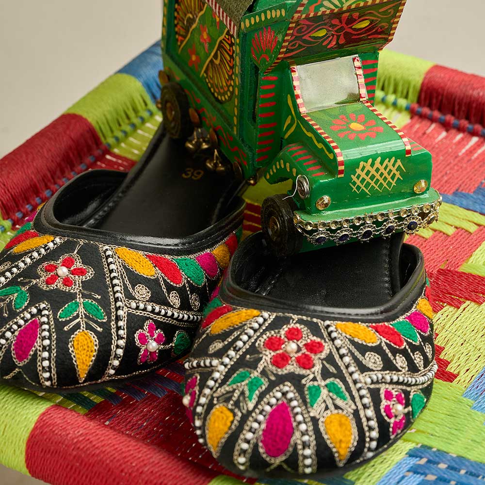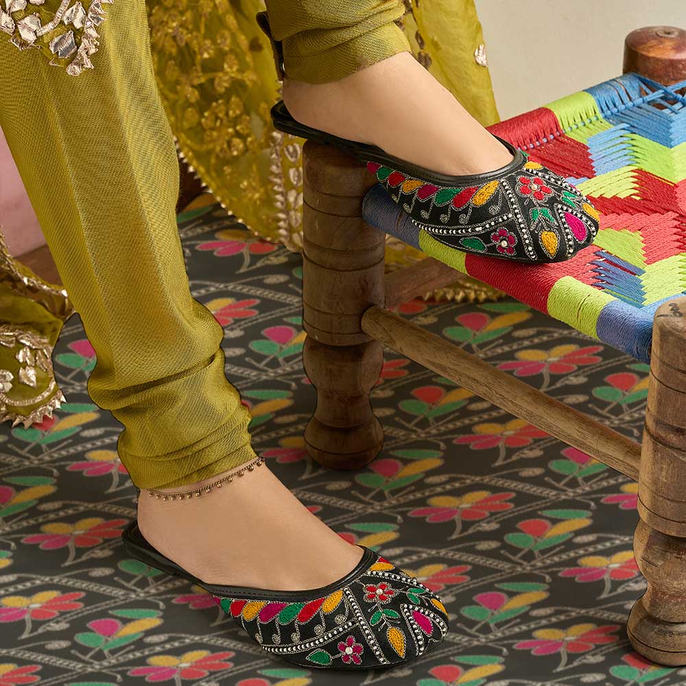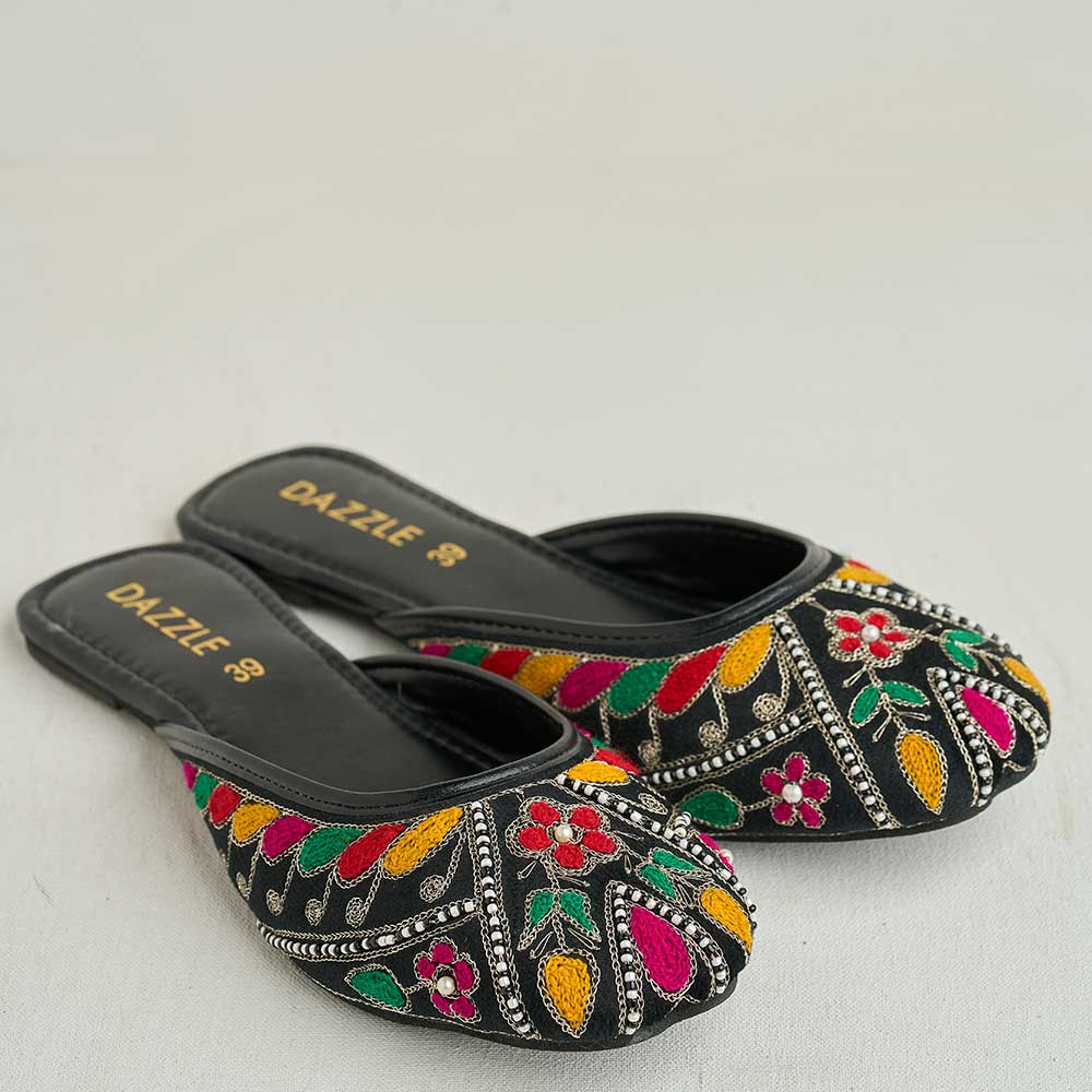 "Elisa" where elegance meets artistry. Step into style with this black velvet pair, adorned with vibrant hand embroidery that adds a pop of color to your every move. Perfect for festive charm and everyday grace.