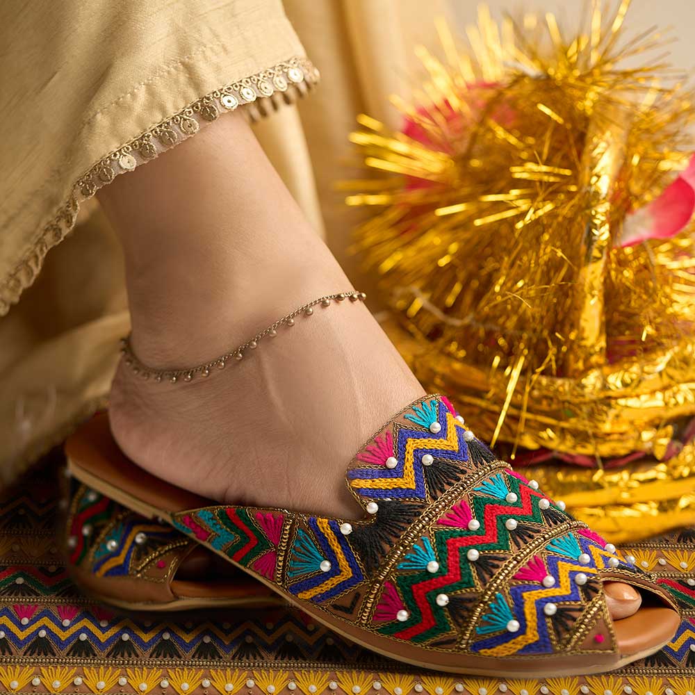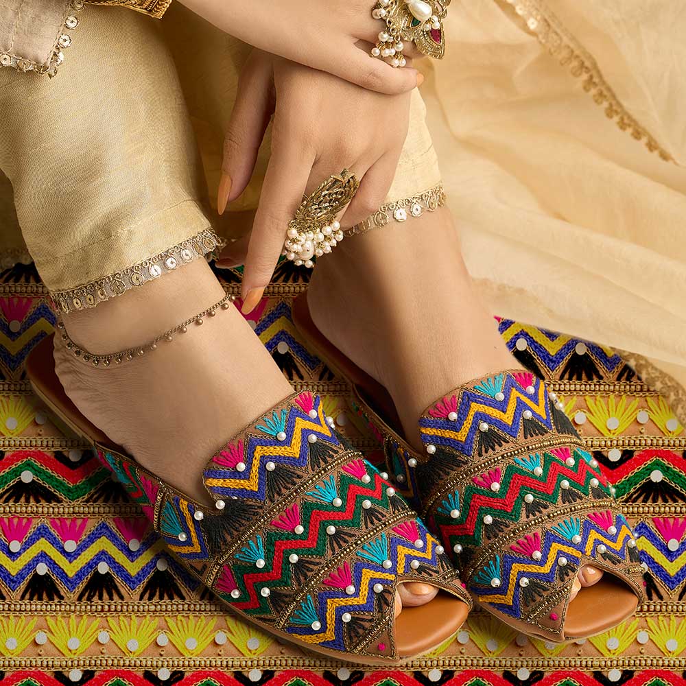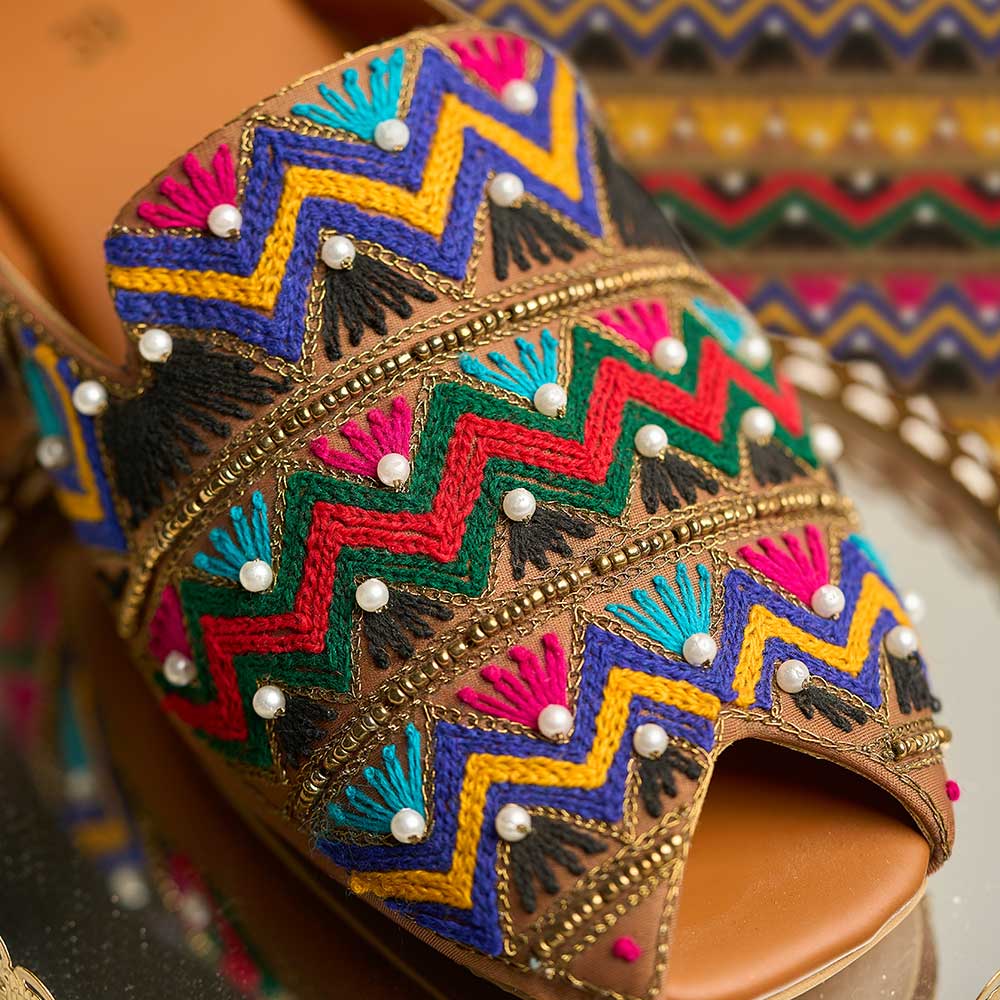 “Judith” bold, colorful, and full of charm! Adorned with vibrant multi-color embroidery on soft lycra, this pair adds a playful pop to any look while keeping comfort at its core.