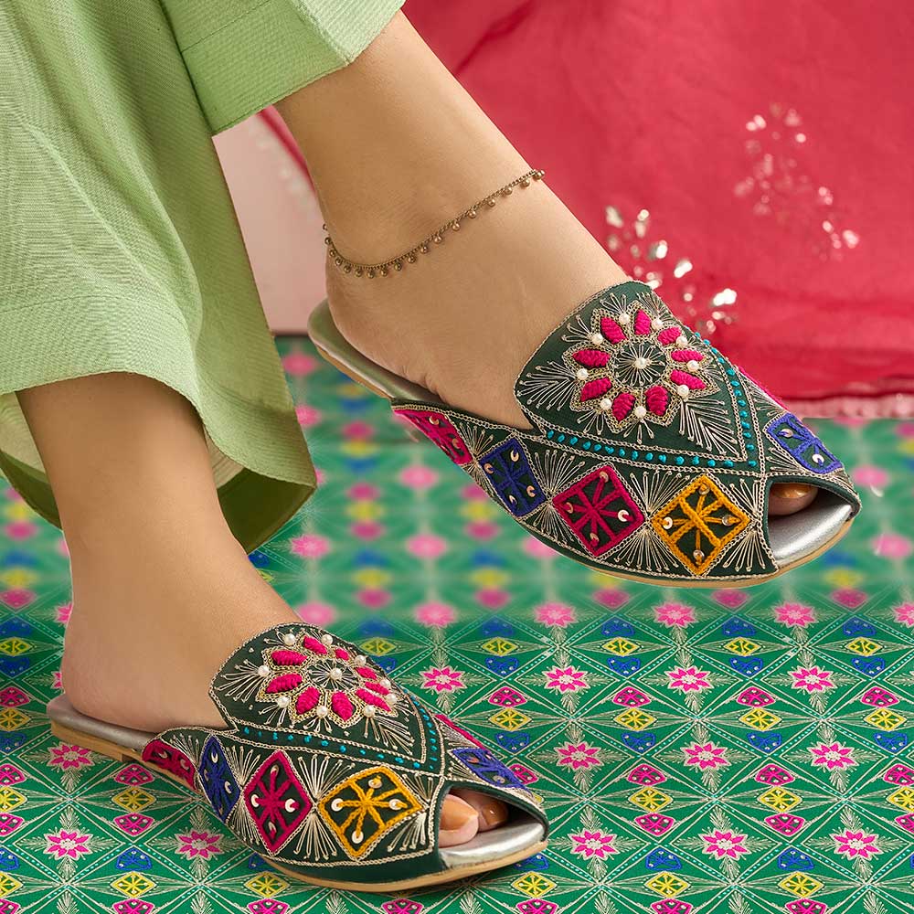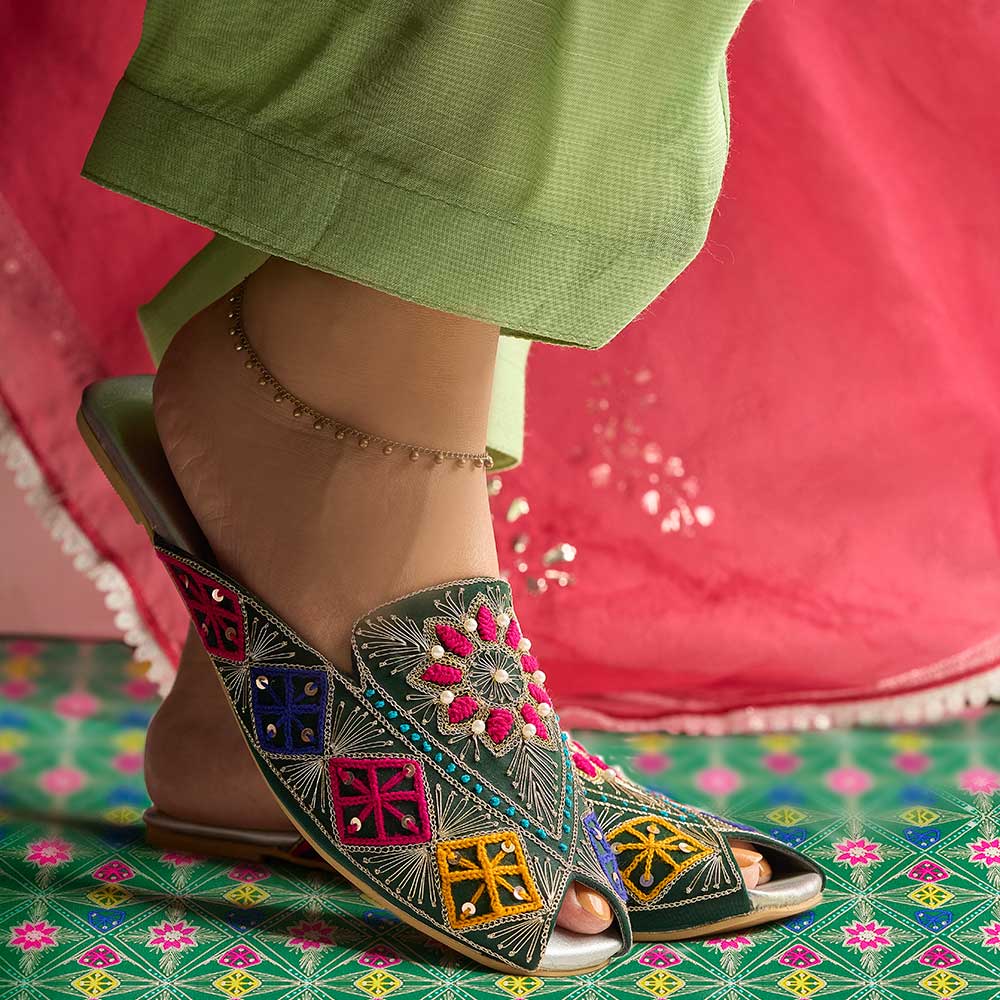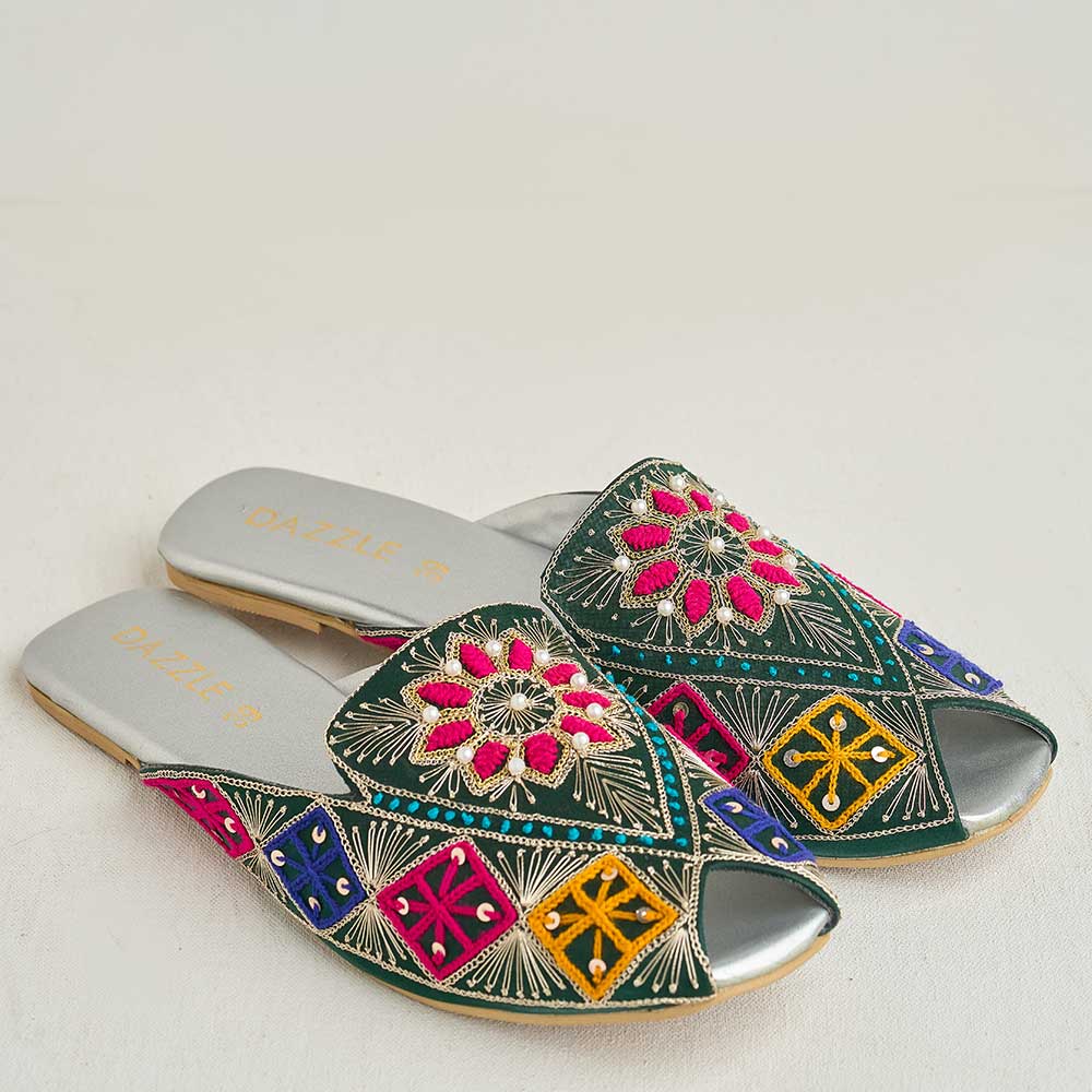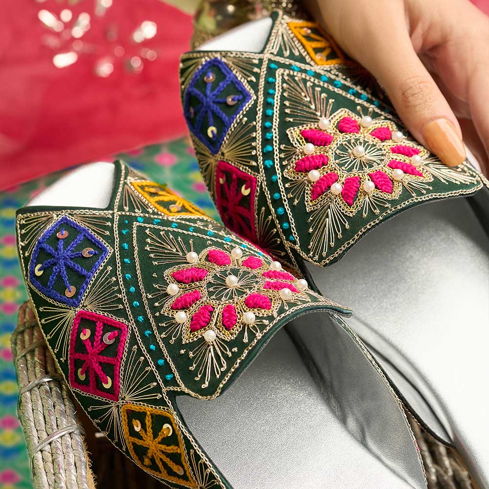 “Lauren” an elegant blend of tradition and grace, crafted on rich satin in a deep bottle green tone. Adorned with intricate multi-color embroidery, this pair brings timeless charm with a modern twist.