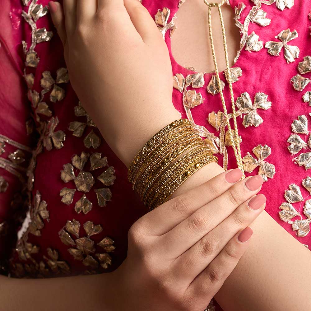 A timeless traditional bangle set in gold tones that radiates ethnic beauty. It's an essential piece for weddings and festive attire because of its fine detailing and polished finish.